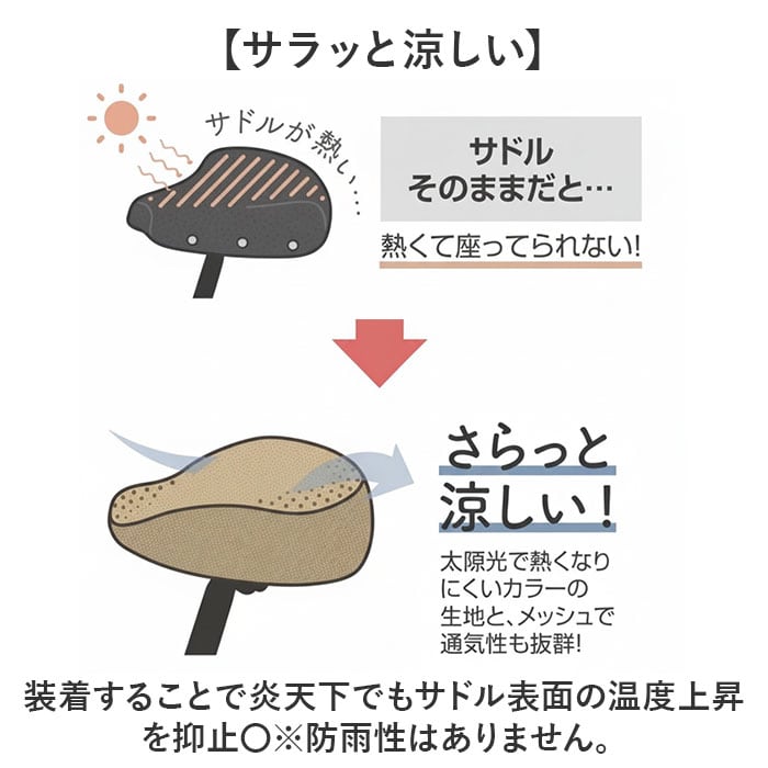 ・装着することで炎天下でもサドル表面の温度上昇を抑止〇※防雨性はありません。