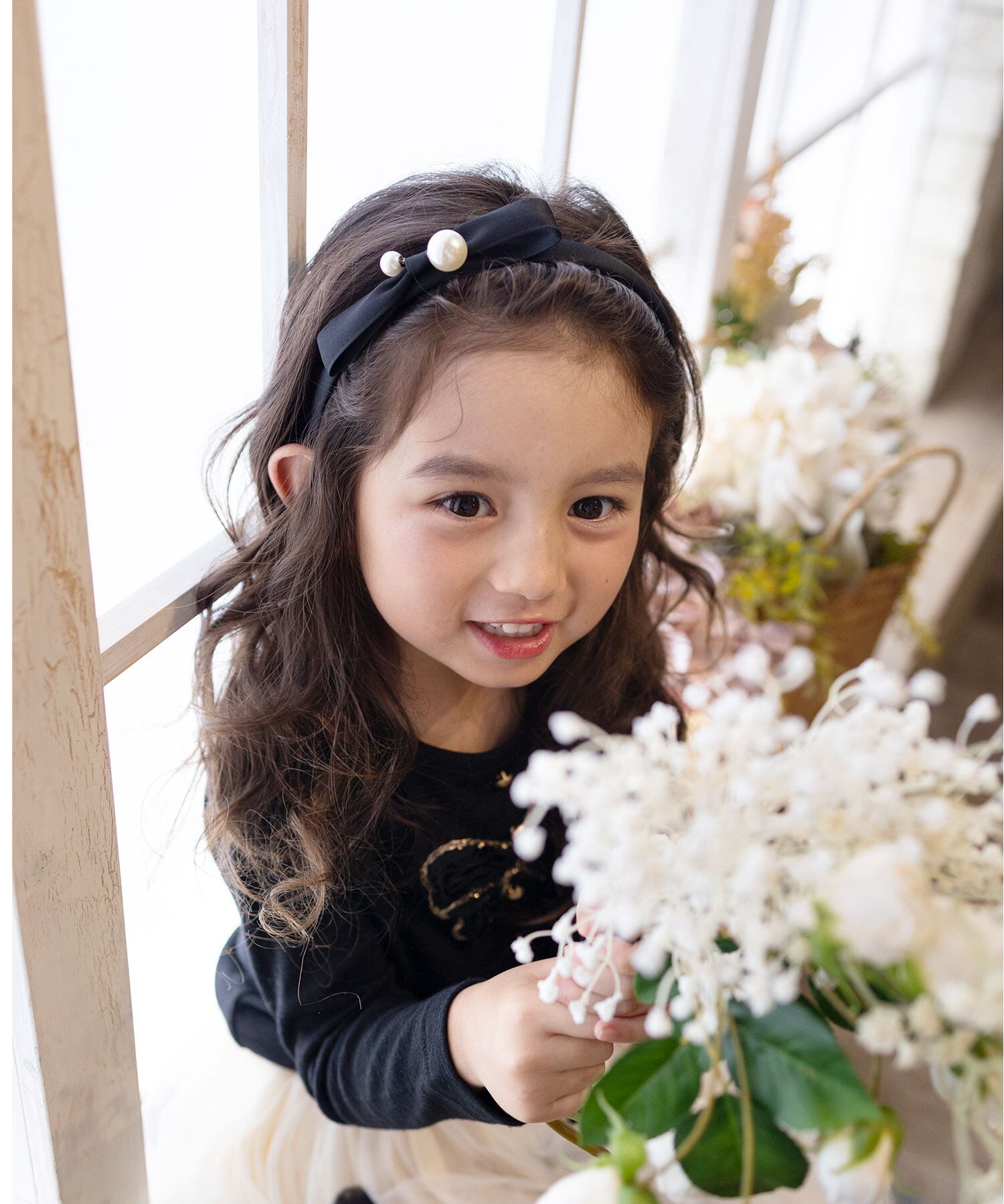 ・ツヤ感のあるサテンリボンが美しく髪を彩り、品格あるスタイルを演出。