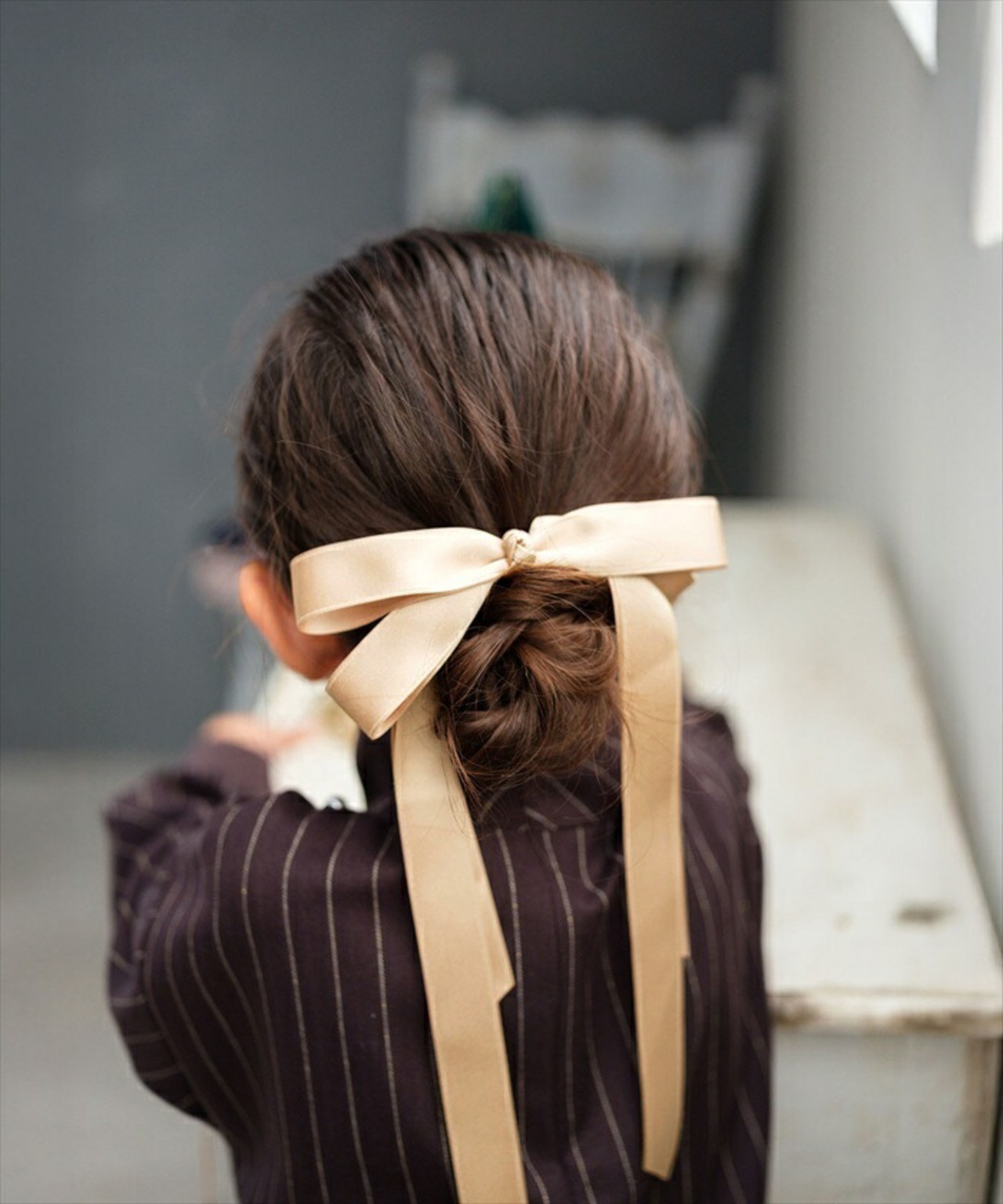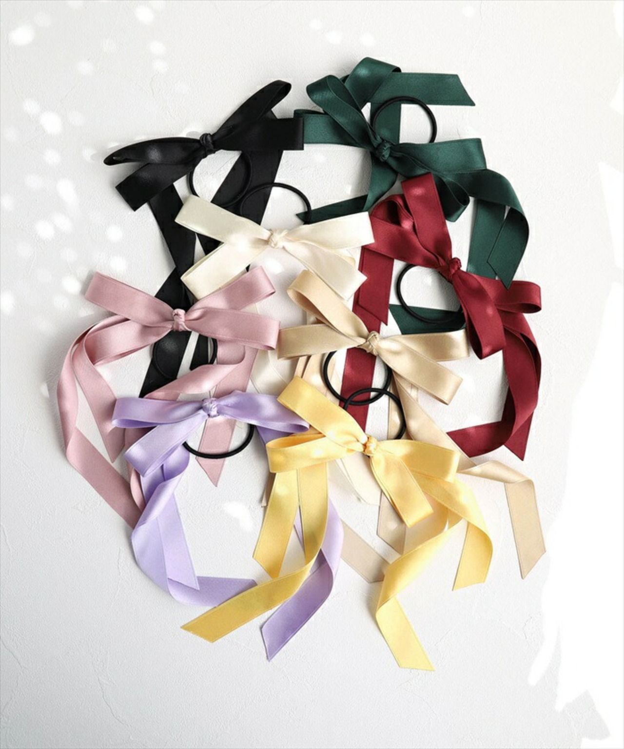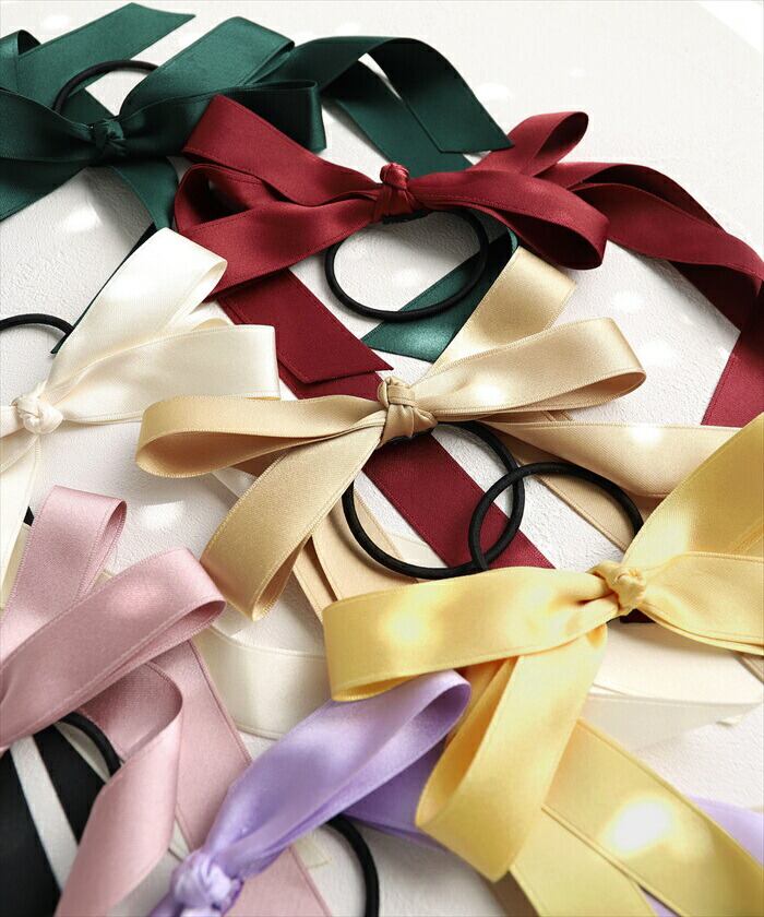 ・髪をしっかり束ねてくれる、安心感のある太めゴム。結び目も美しく、崩れにくいのが嬉しいポイント。流れるリボンが、優雅な雰囲気を長時間保ちます。
