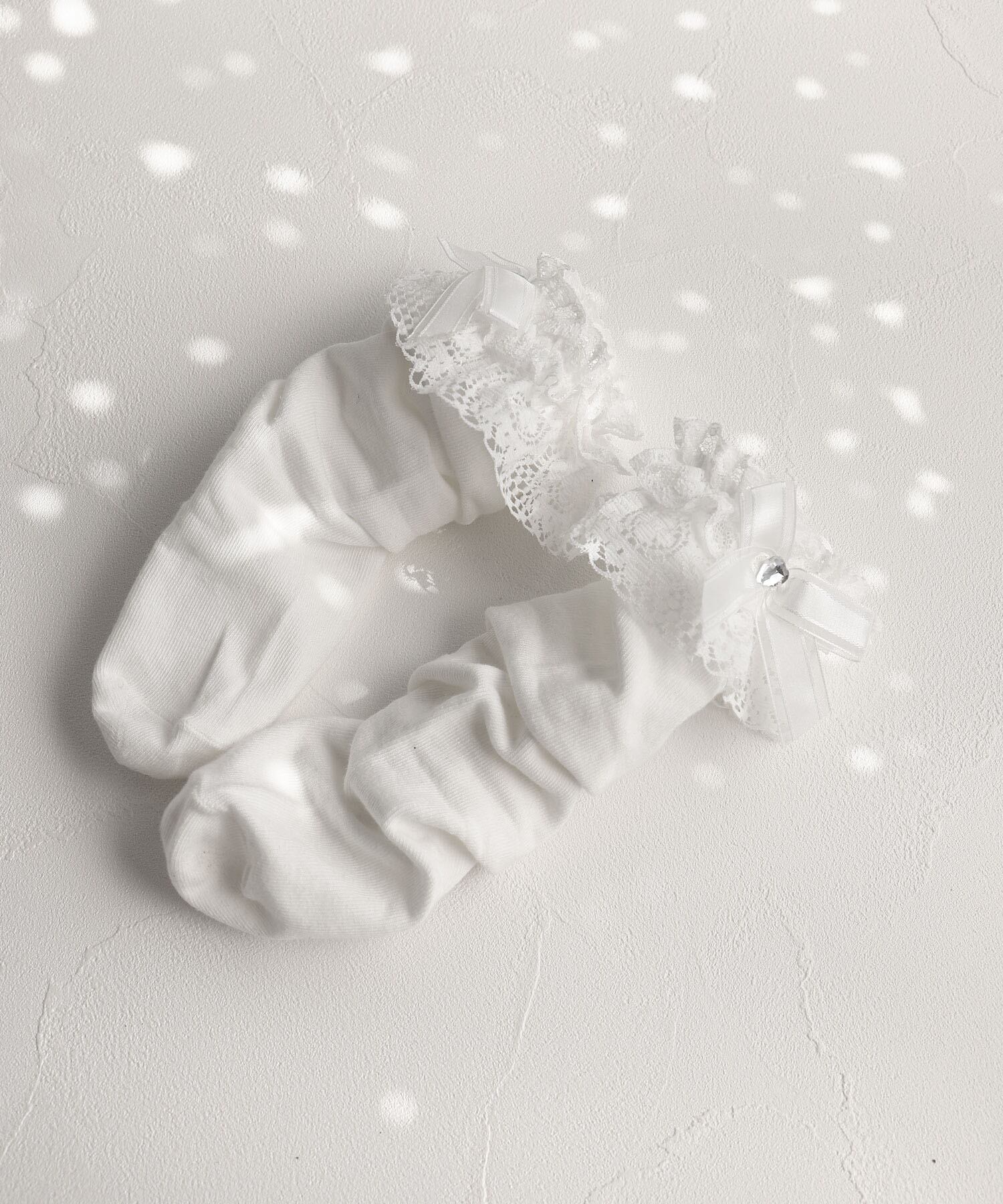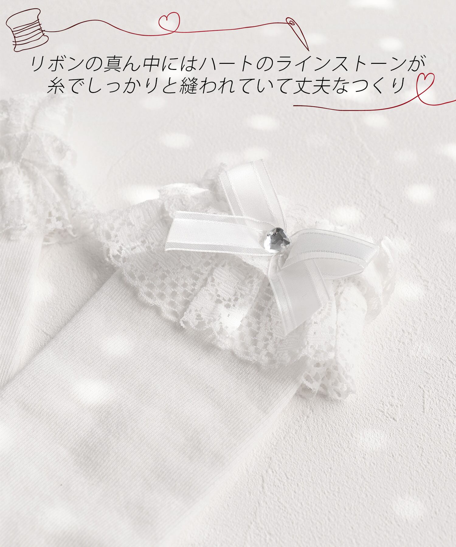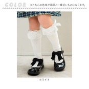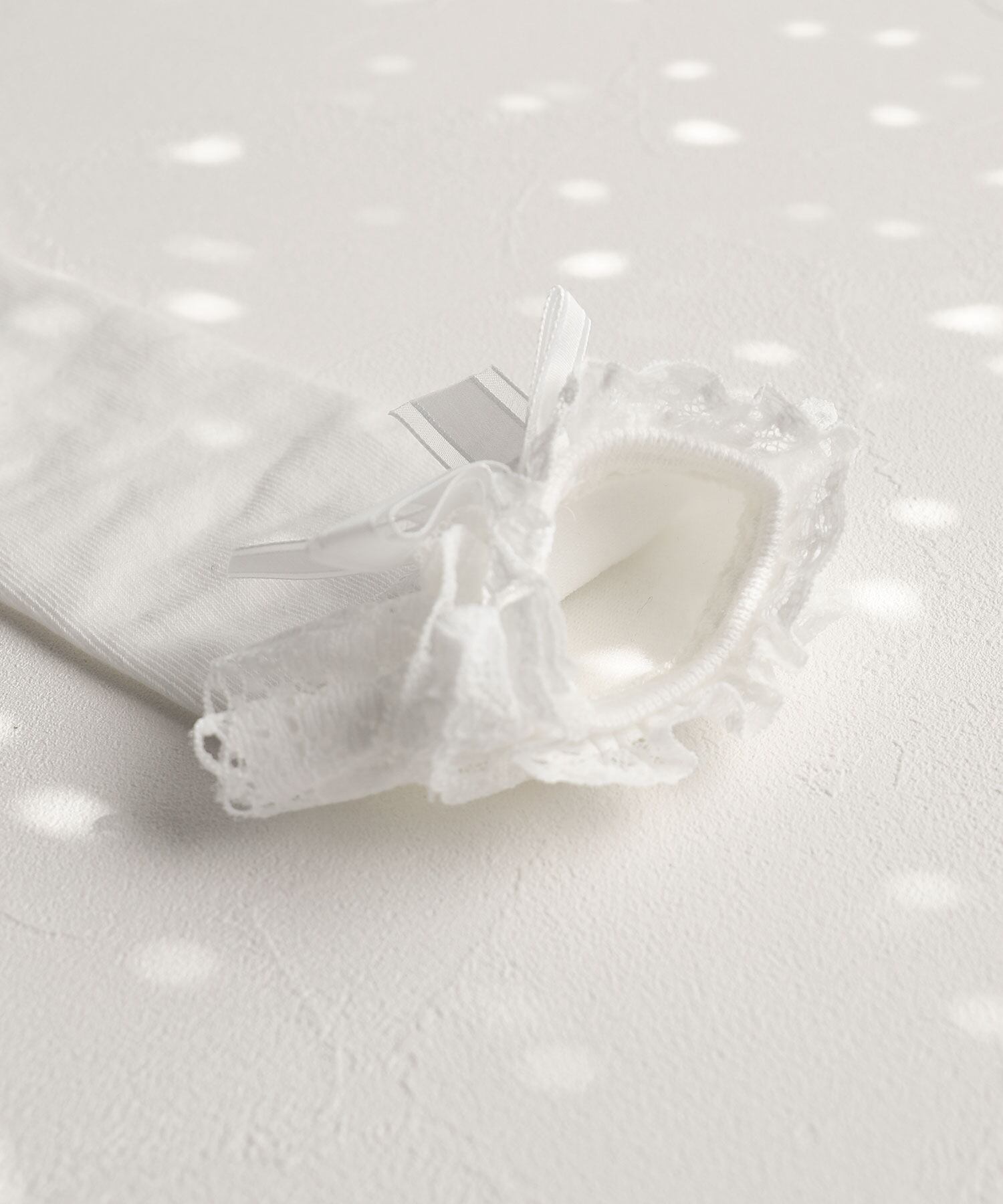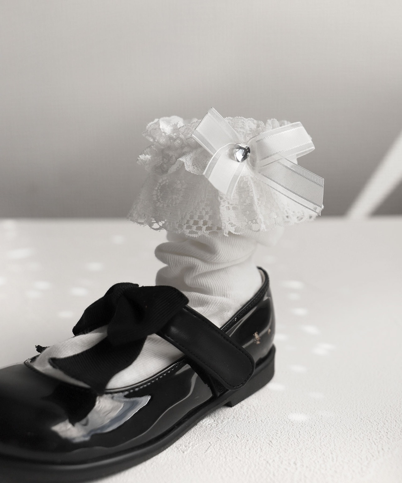 ・その履き口には繊細なリボンとレースがたっぷりとあしらわれ、お子様の足元を上品に飾り、清楚な印象を際立たせます。