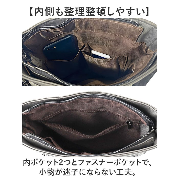 ・内ポケット2つとファスナーポケットで、小物が迷子にならない工夫。