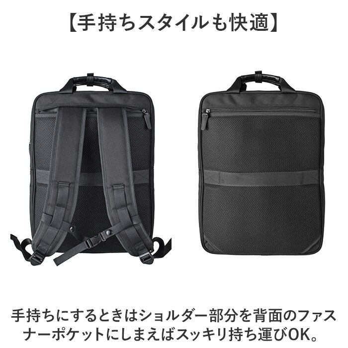 ・手持ちにするときはショルダー部分を背面のファスナーポケットにしまえばスッキリ持ち運びOK。