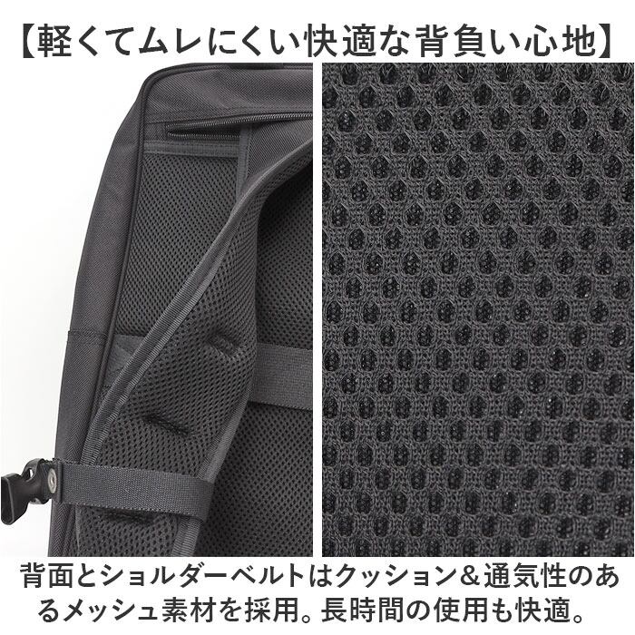 ・背面とショルダーベルトはクッション&通気性のあるメッシュ素材を採用。長時間の使用も快適。