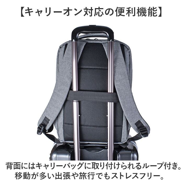 ・背面にはキャリーバッグに取り付けられるループ付き。移動が多い出張や旅行でもストレスフリー