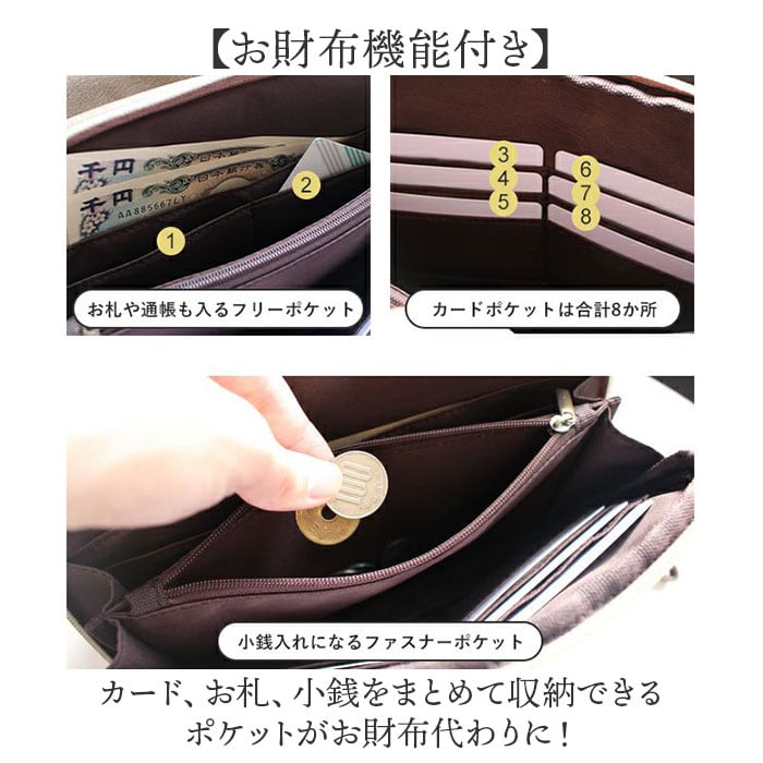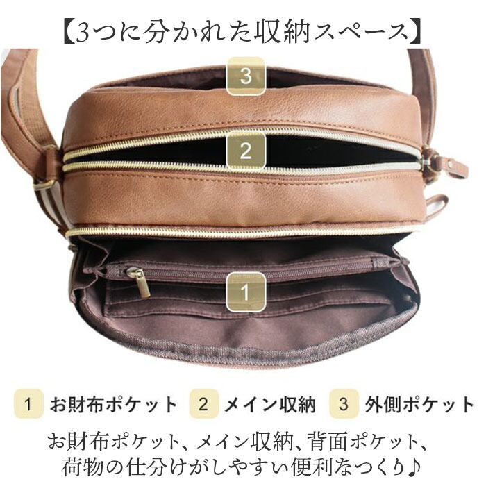 ・お財布ポケット、メイン収納、背面ポケット、荷物の仕分けがしやすい便利なつくり♪