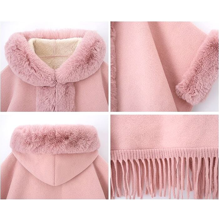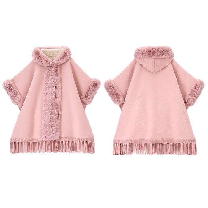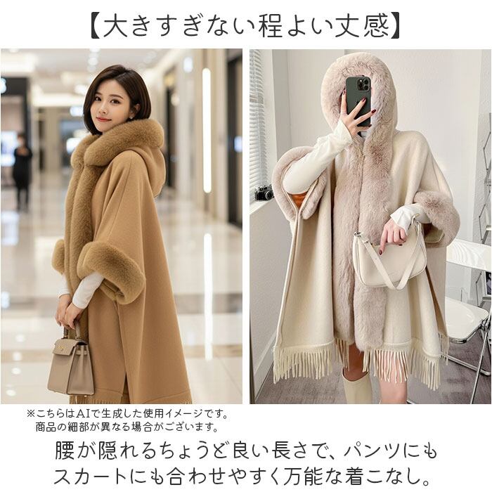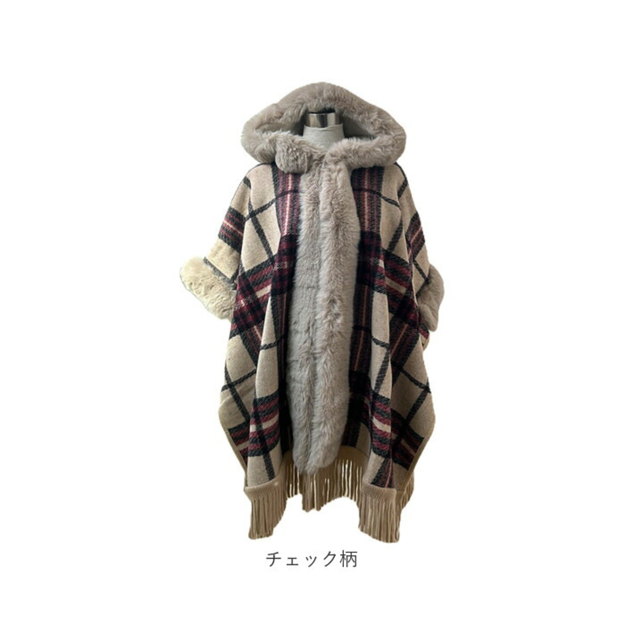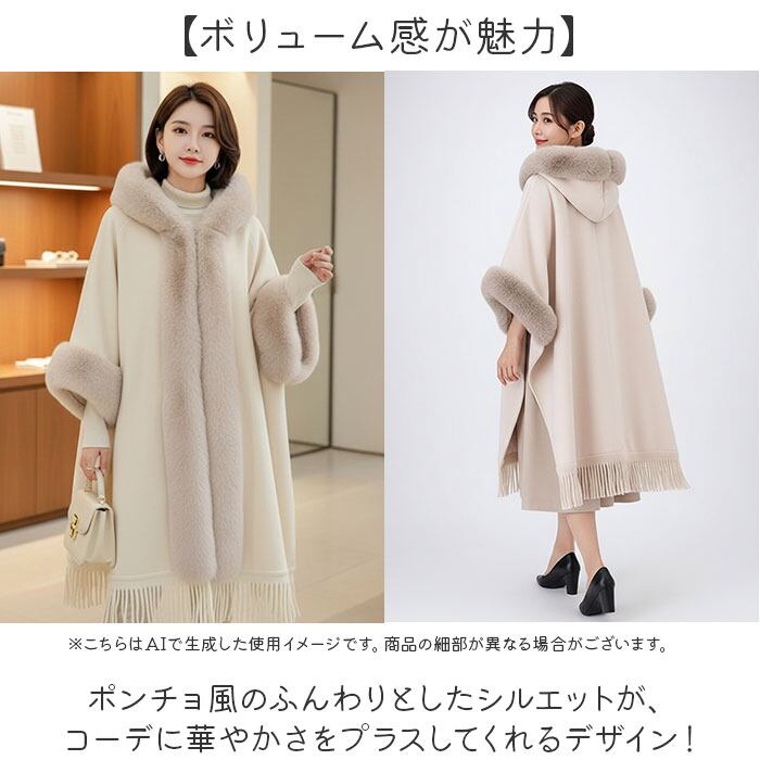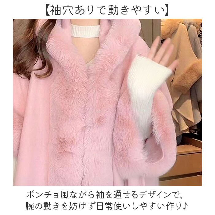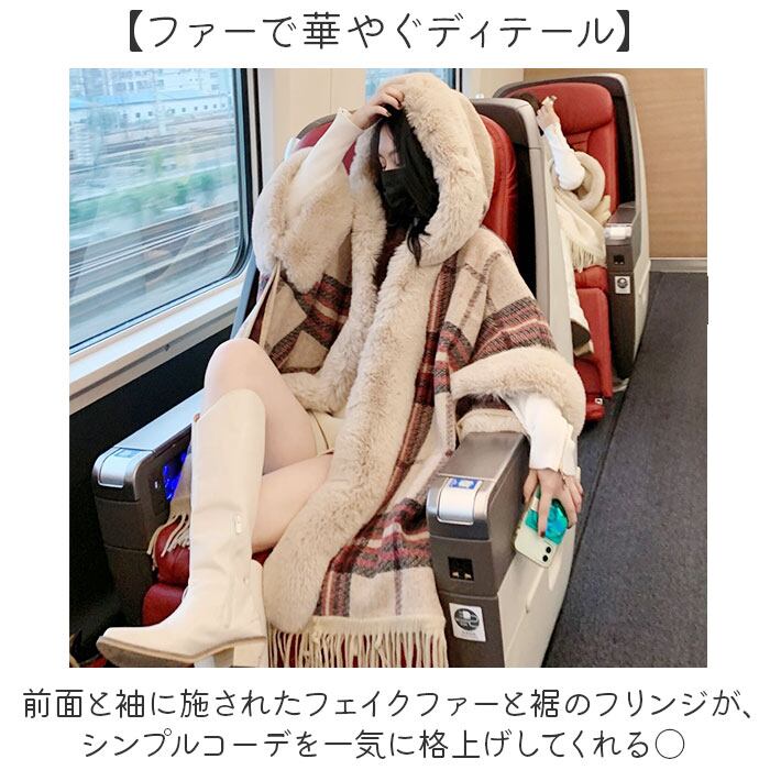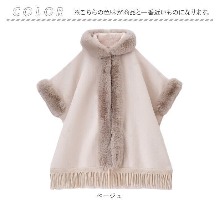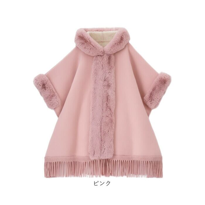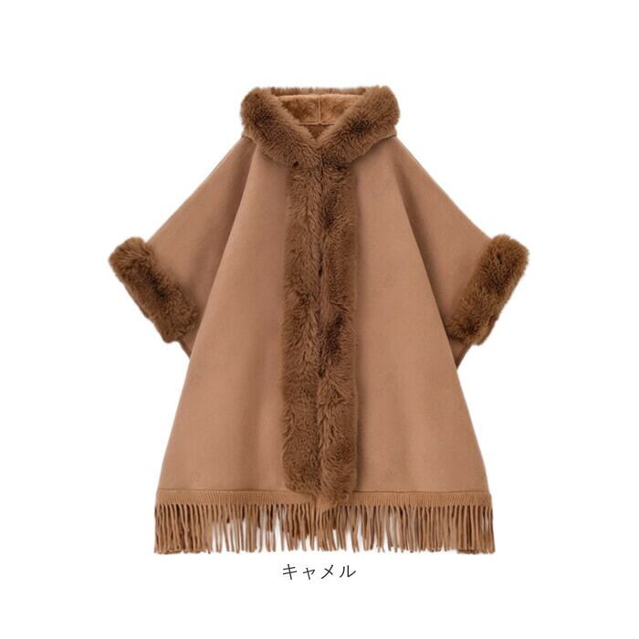 ・ファー付きで華やか、暖かくて可愛いポンチョ風アウター。