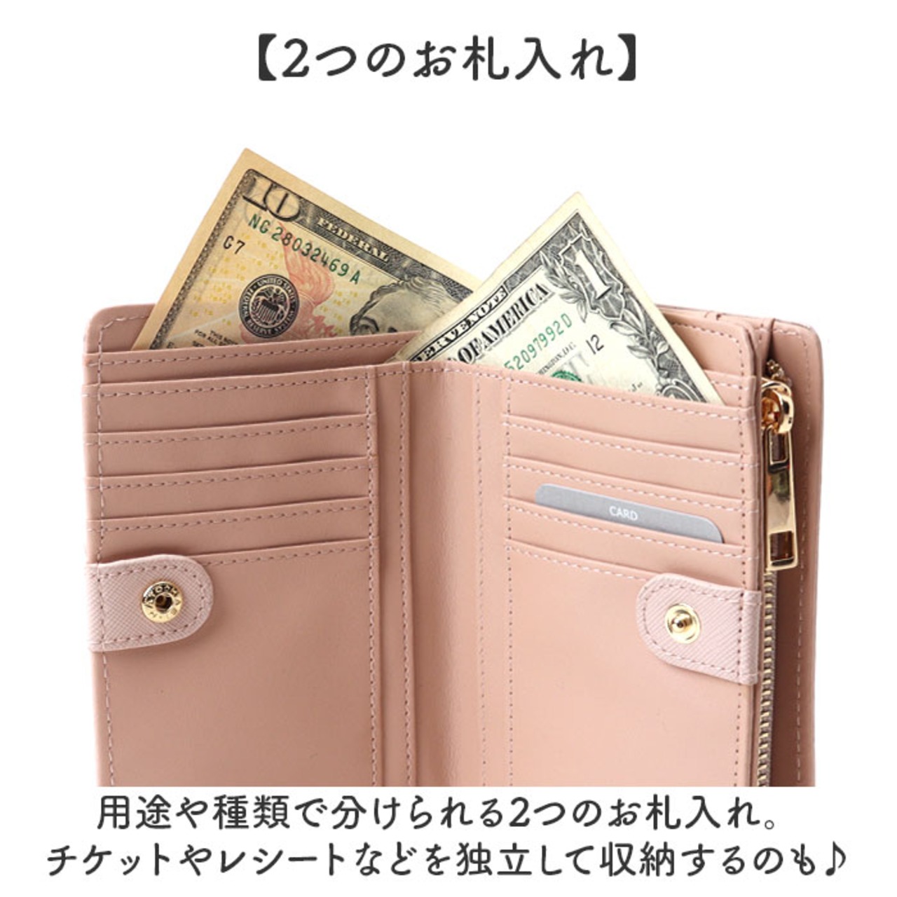 ・用途や種類で分けられる2つのお札入れ。チケットやレシートなどを独立して収納するのも♪