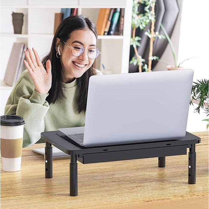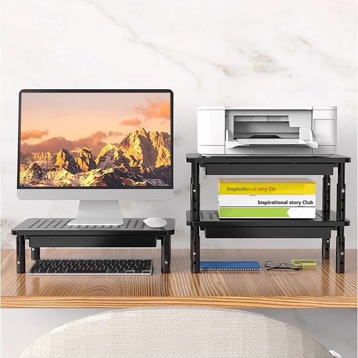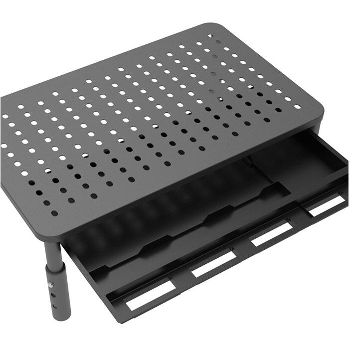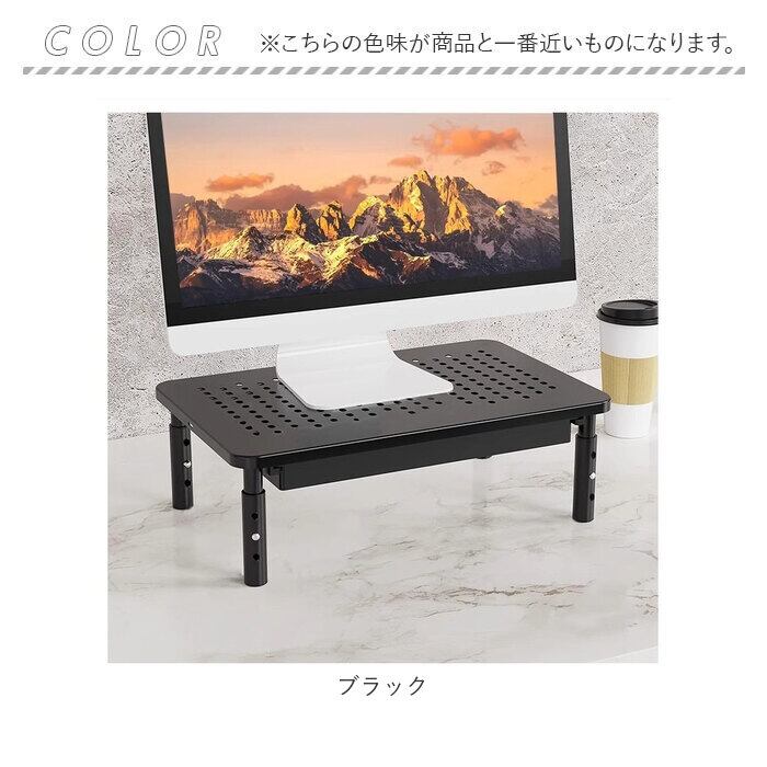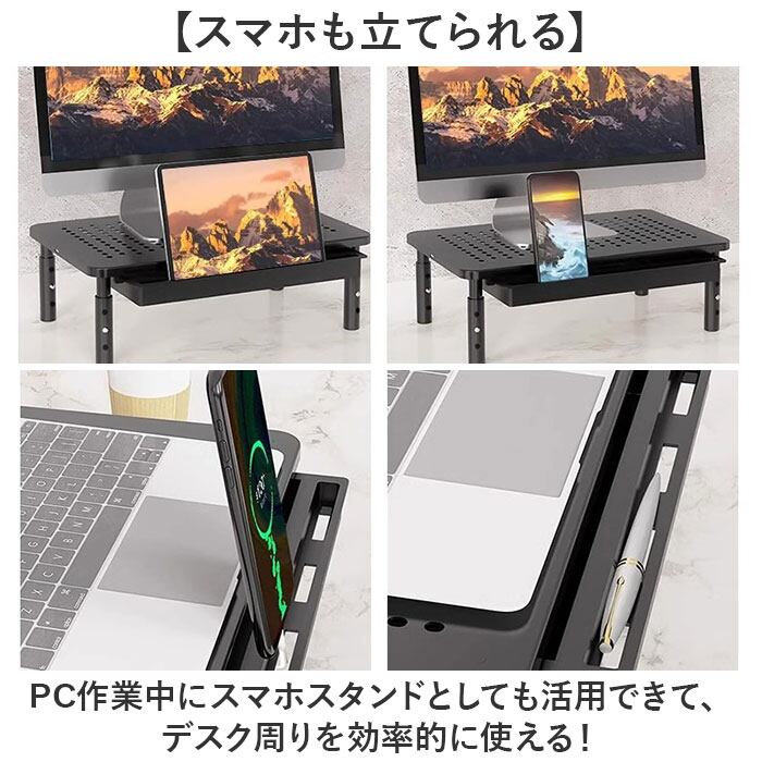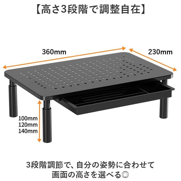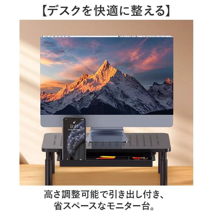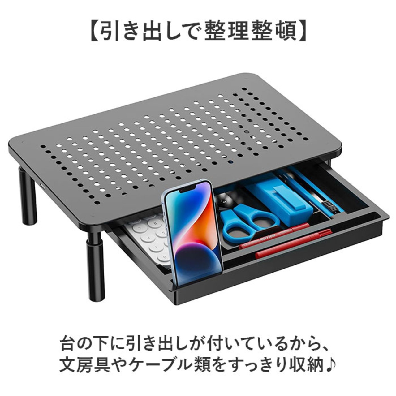 ・高さ調整可能で引き出し付き、省スペースなモニター台。