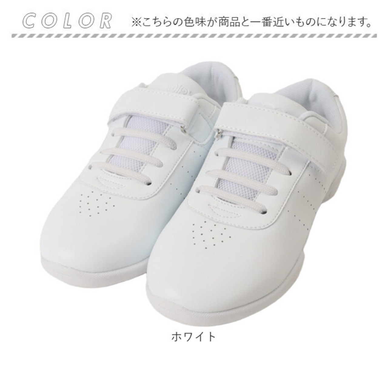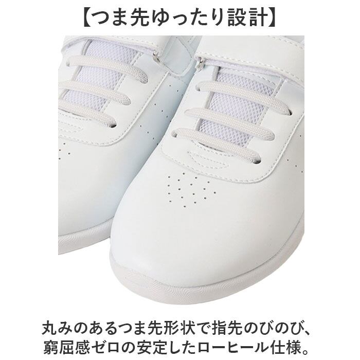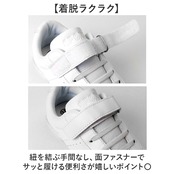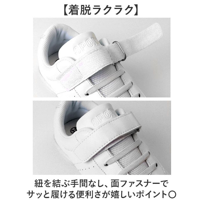 ・紐を結ぶ手間なし、面ファスナーでサッと履ける便利さが嬉しいポイント〇