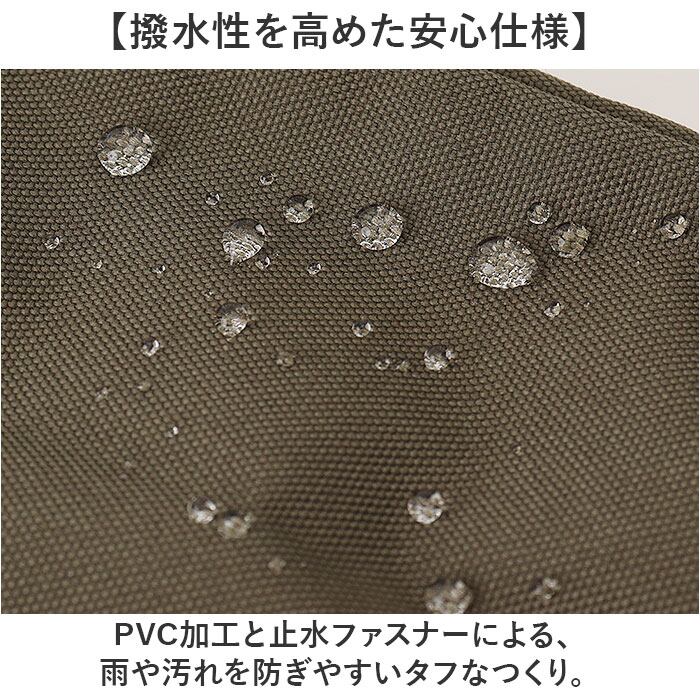 ・PVC加工と止水ファスナーによる、雨や汚れを防ぎやすいタフなつくり。