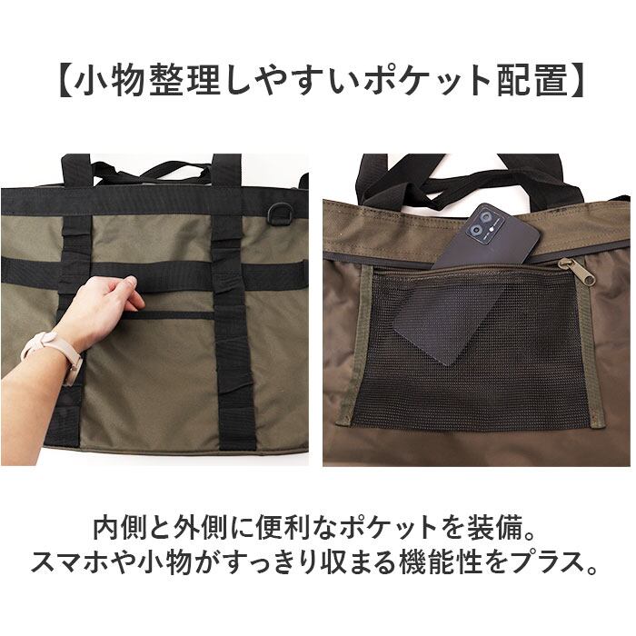 ・内側と外側に便利なポケットを装備。スマホや小物がすっきり収まる機能性をプラス。