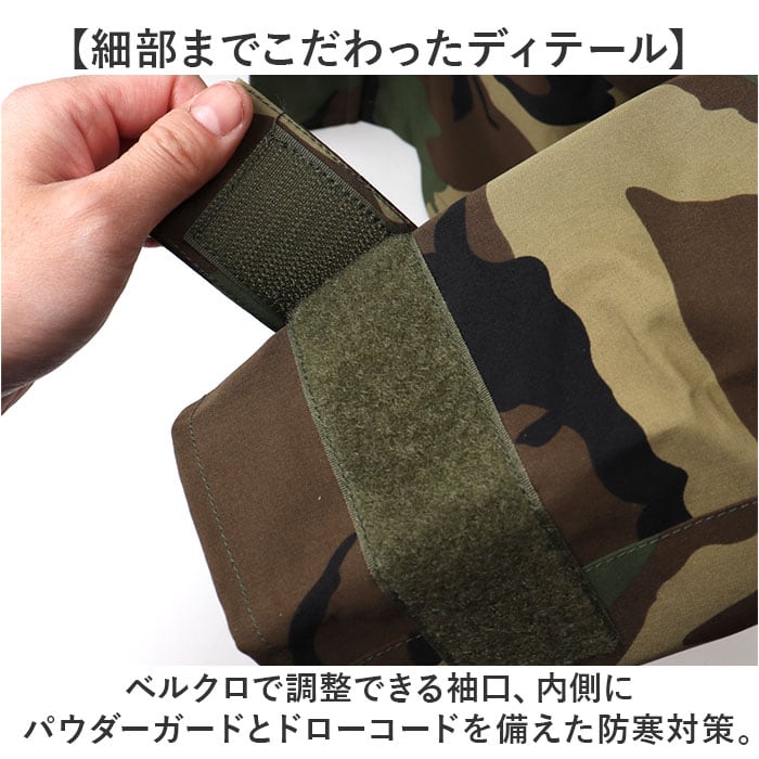 ・ベルクロで調整できる袖口、内側にパウダーガードとドローコードを備えた防寒対策。