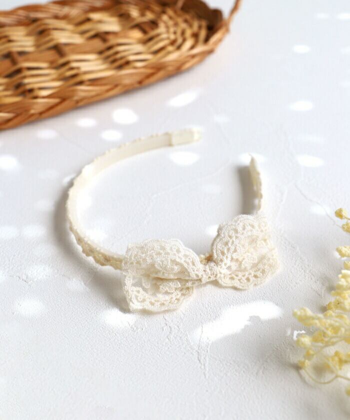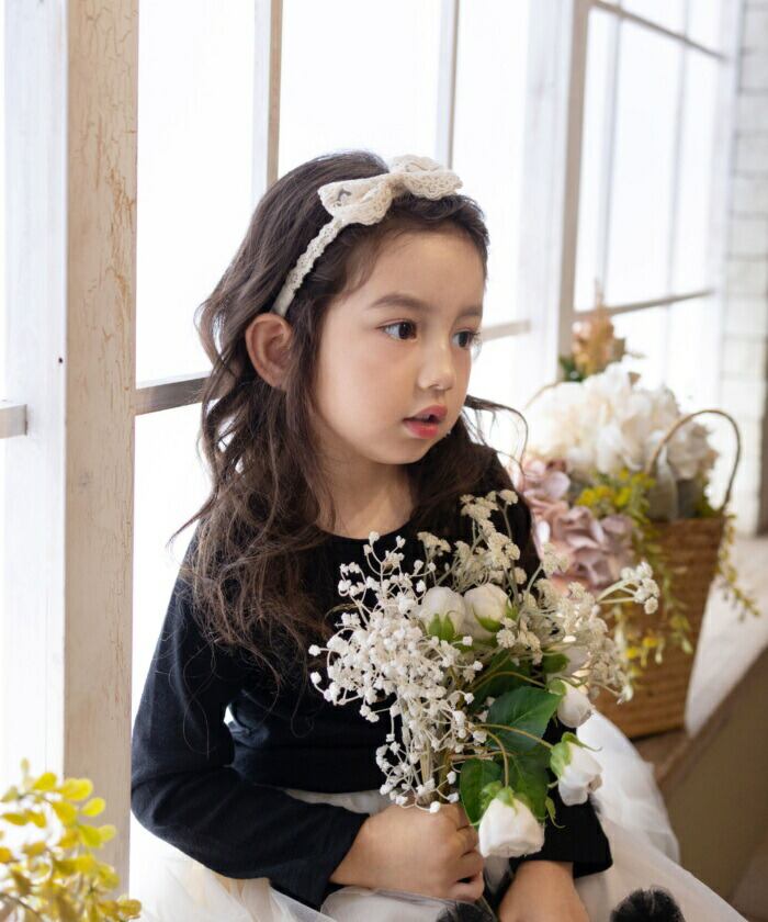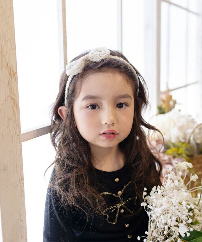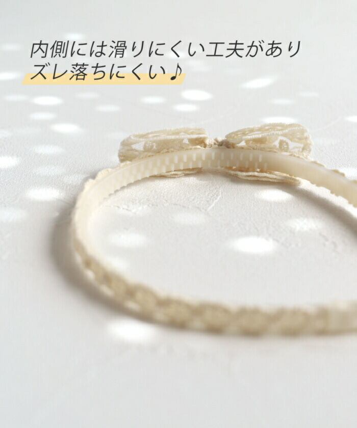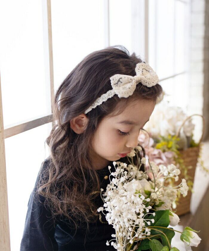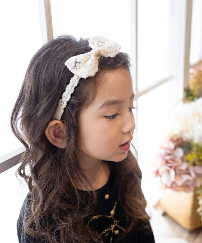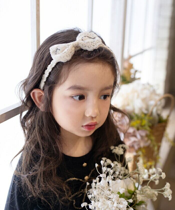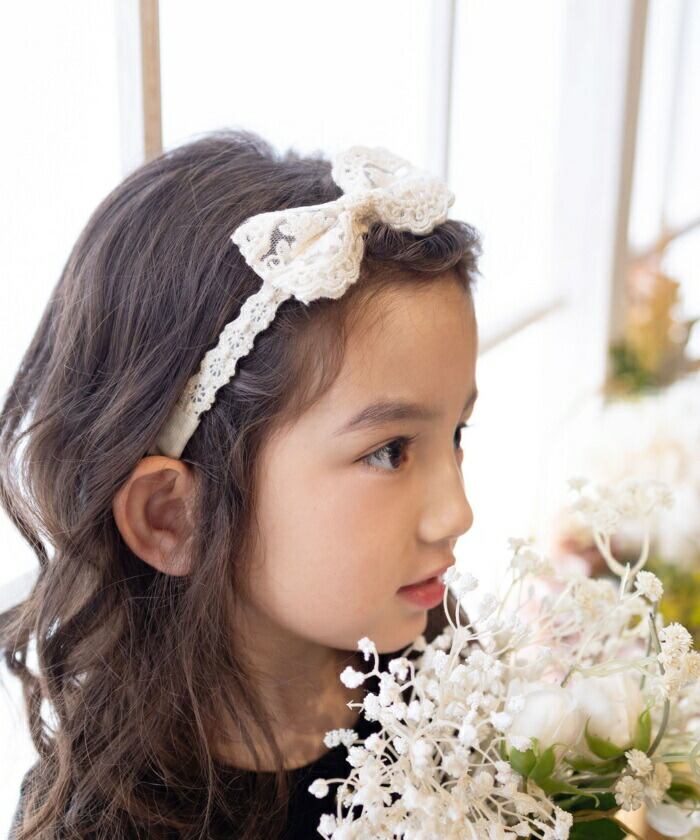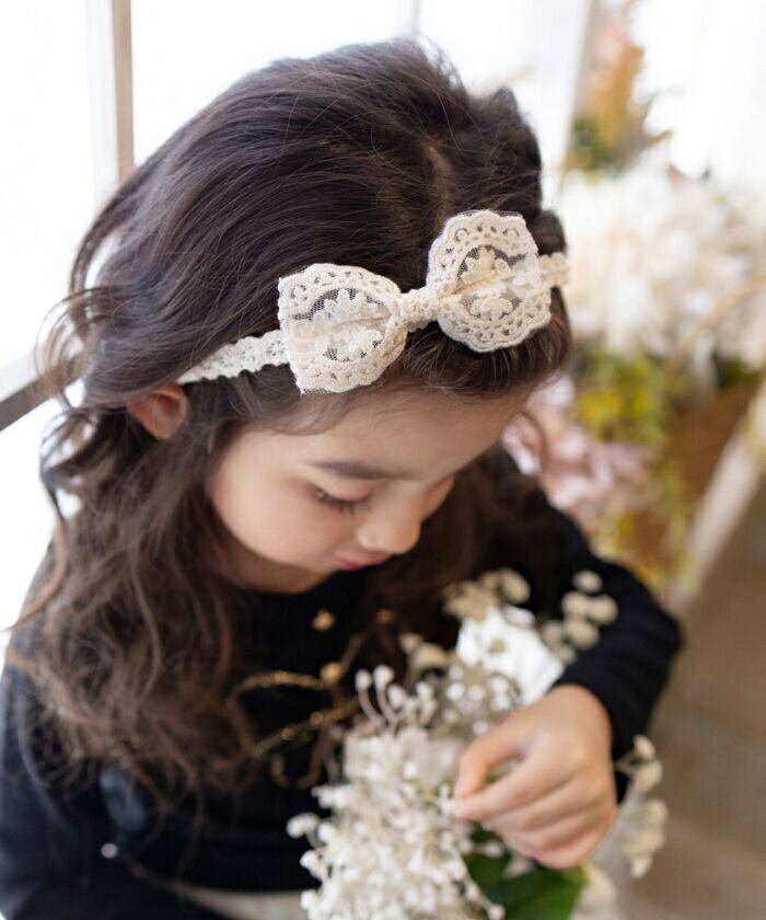 ・柔らかな素材感で締め付けすぎず、お子様にも快適にお使いいただけます。頭にフィットしやすくずれにくいので、元気いっぱいに遊んでも大丈夫。可憐なレースが、お子様の笑顔を一層輝かせます。