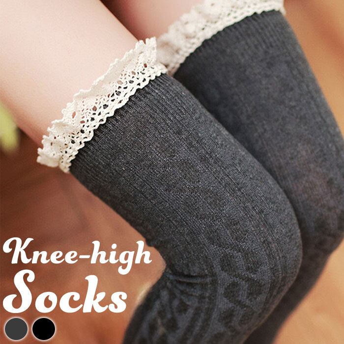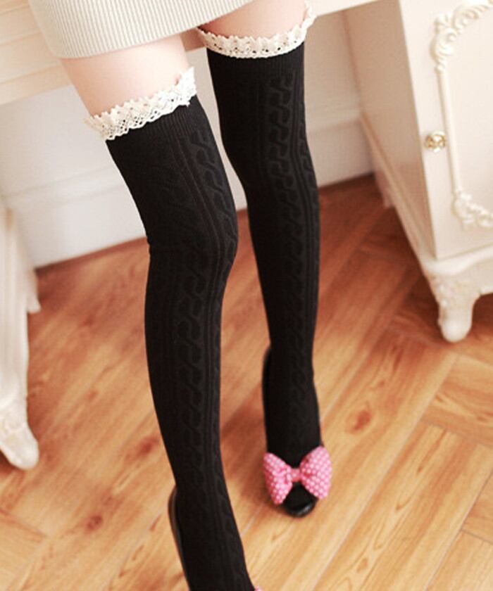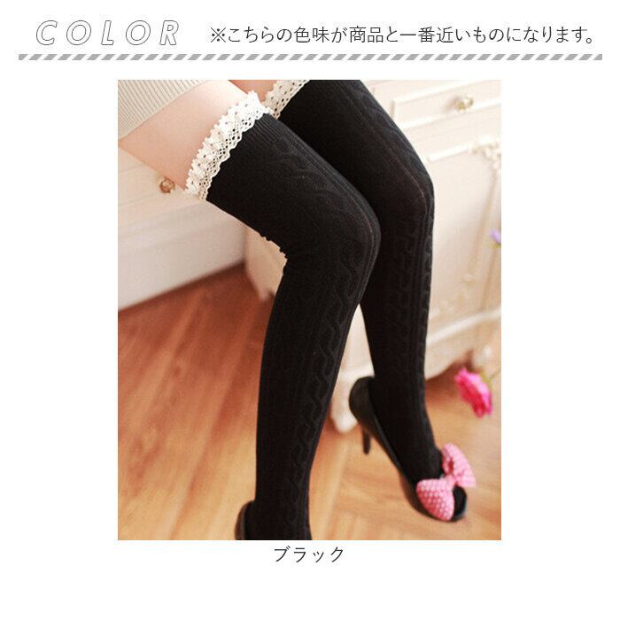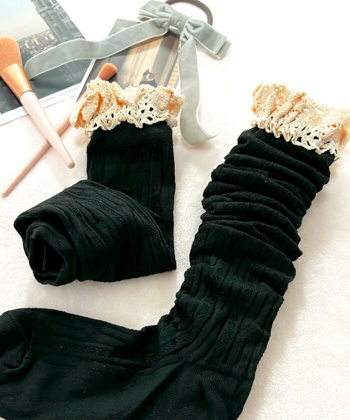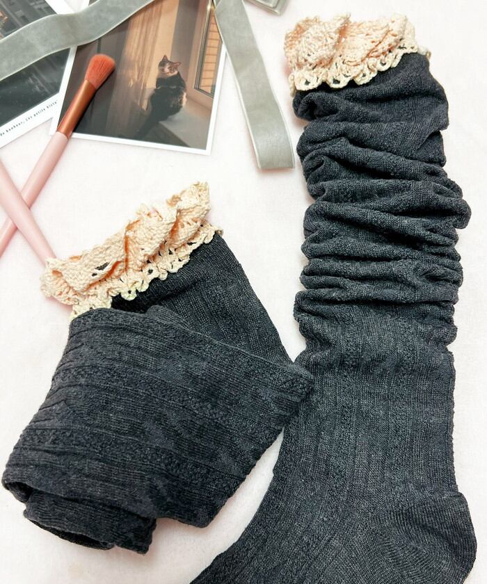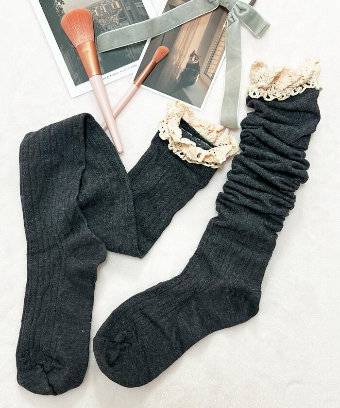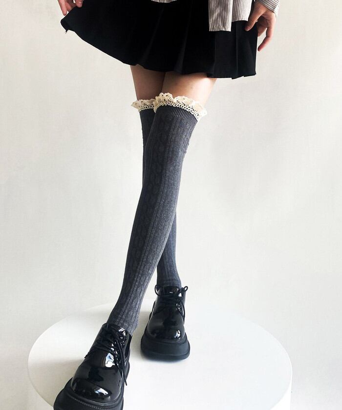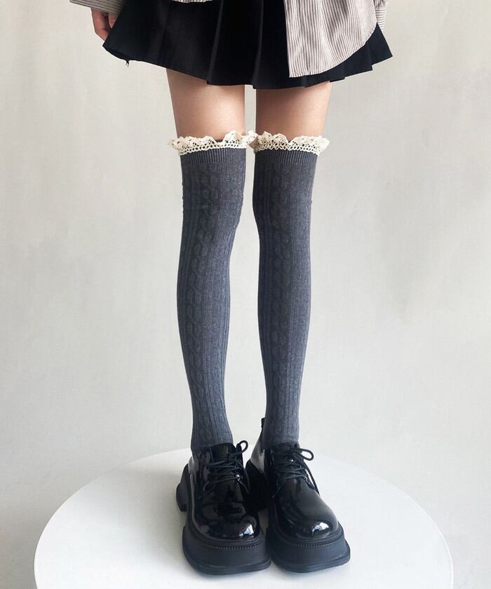 ・ガーリーなフリルを組み合わせたケーブル編みのニーハイソックス。