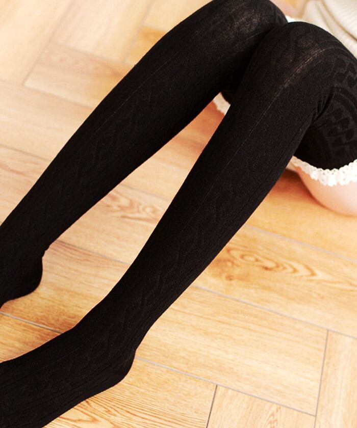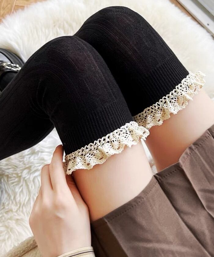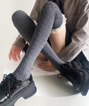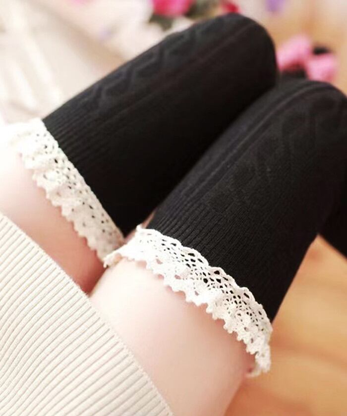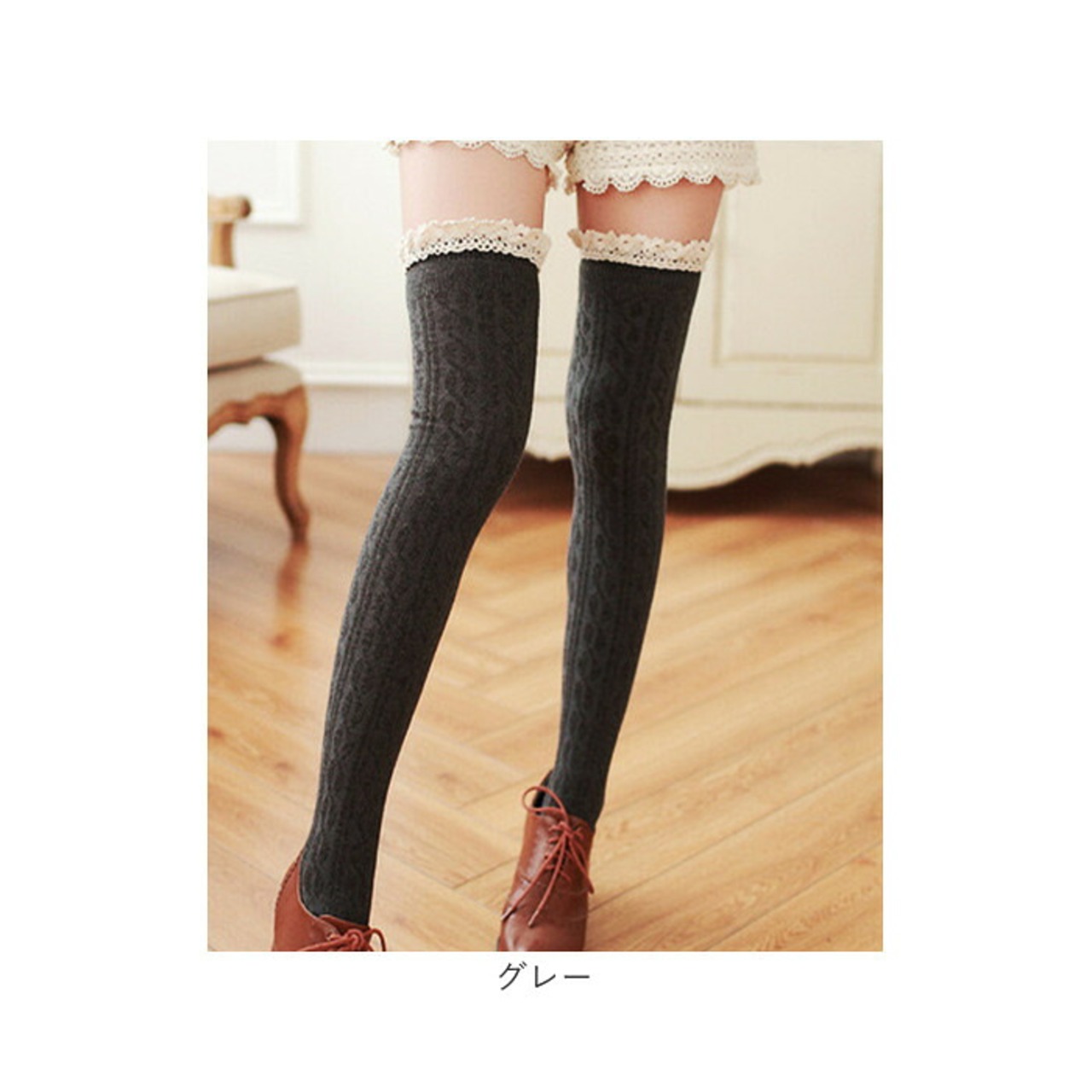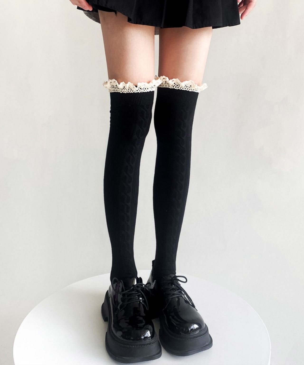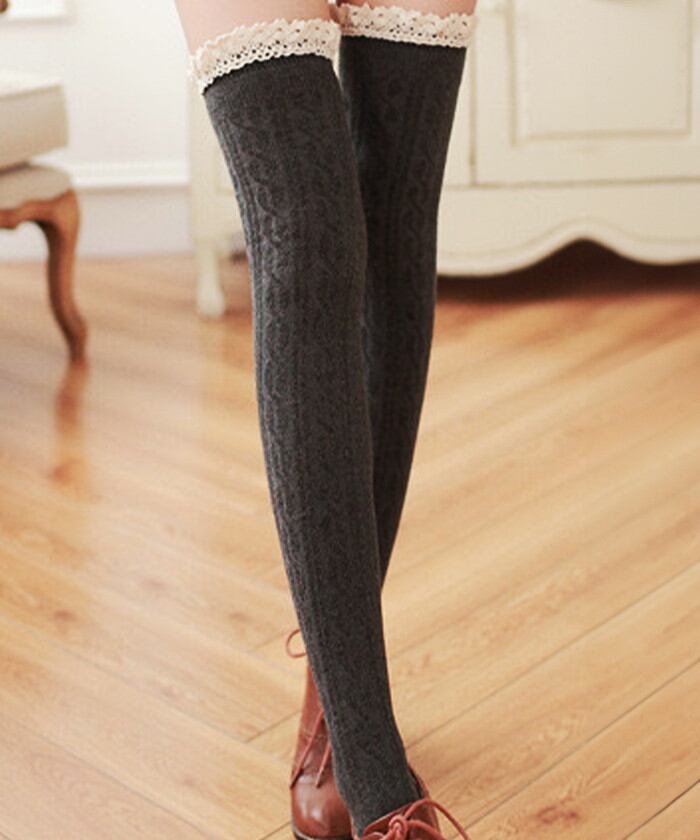 ・ガーリーなフリルを組み合わせたケーブル編みのニーハイソックス。