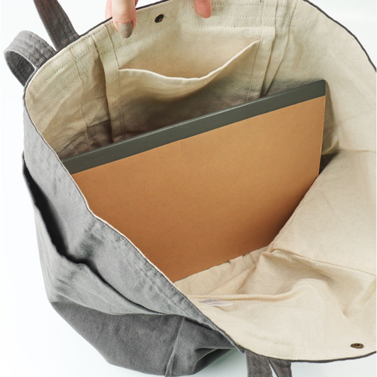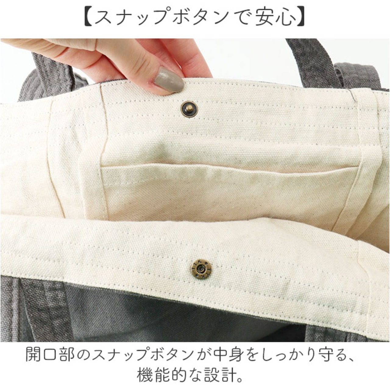 ・開口部のスナップボタンが中身をしっかり守る、機能的な設計。