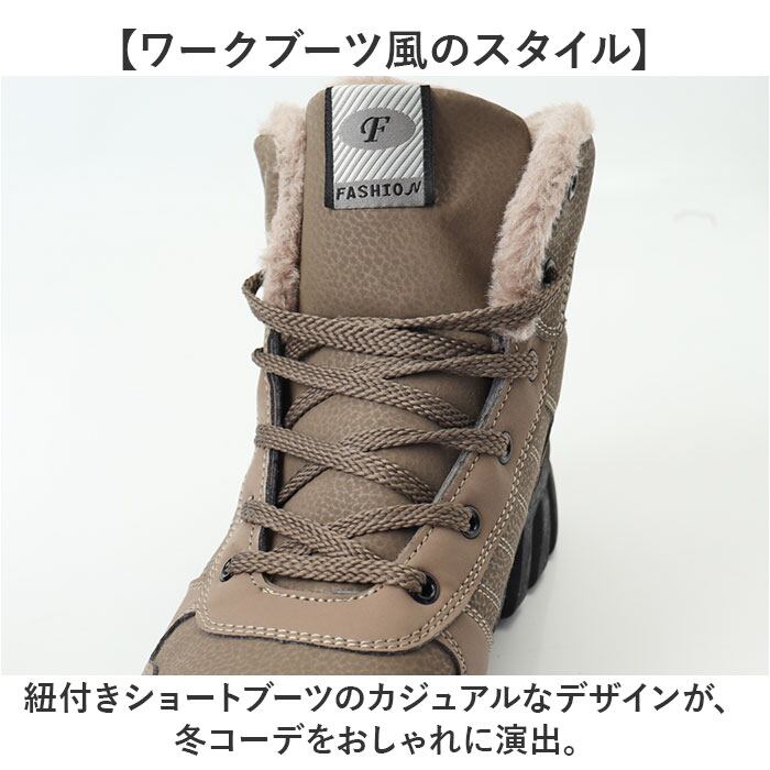 ・紐付きショートブーツのカジュアルなデザインが、冬コーデをおしゃれに演出。