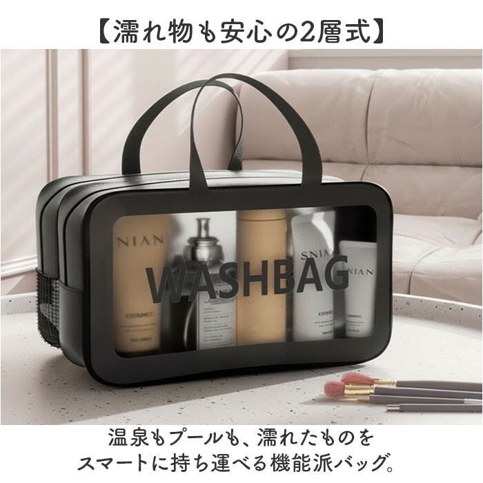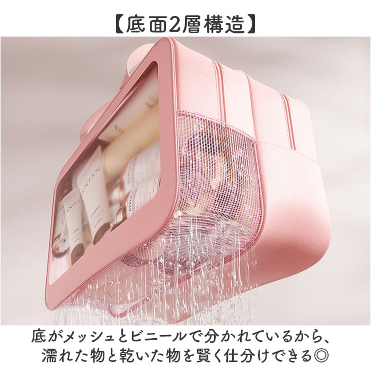 ・底がメッシュとビニールで分かれているから、濡れた物と乾いた物を賢く仕分けできる◎