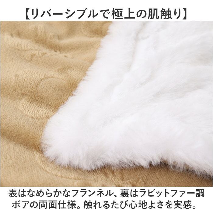 ・表はなめらかなフランネル、裏はラビットファー調ボアの両面仕様。触れるたび心地よさを実感。