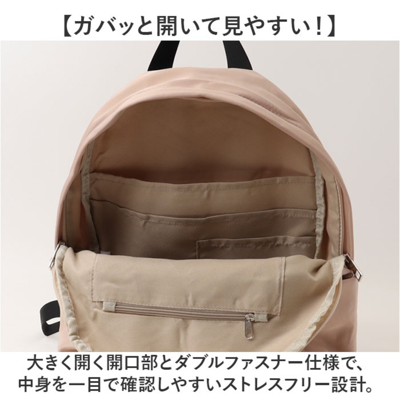 ・大きく開く開口部とダブルファスナー仕様で、中身を一目で確認しやすいストレスフリー設計。