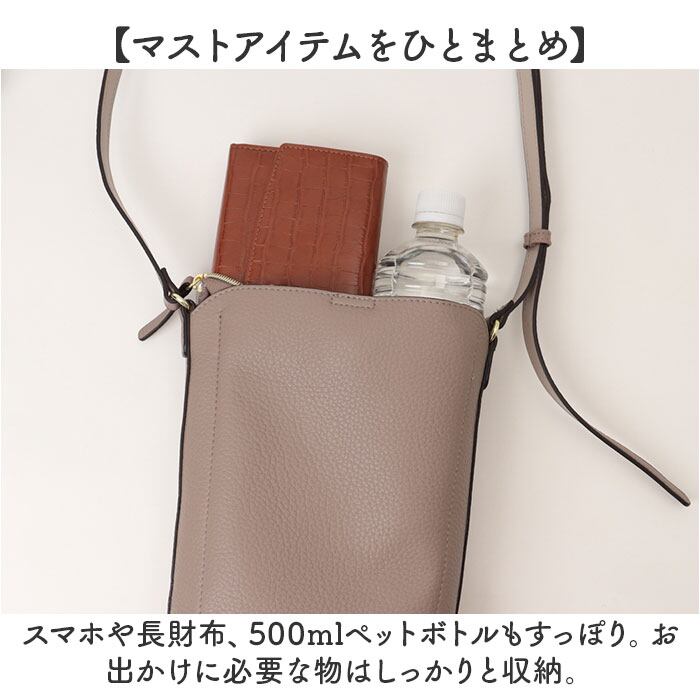 ・スマホや長財布、500mlペットボトルもすっぽり。お出かけに必要な物はしっかりと収納。