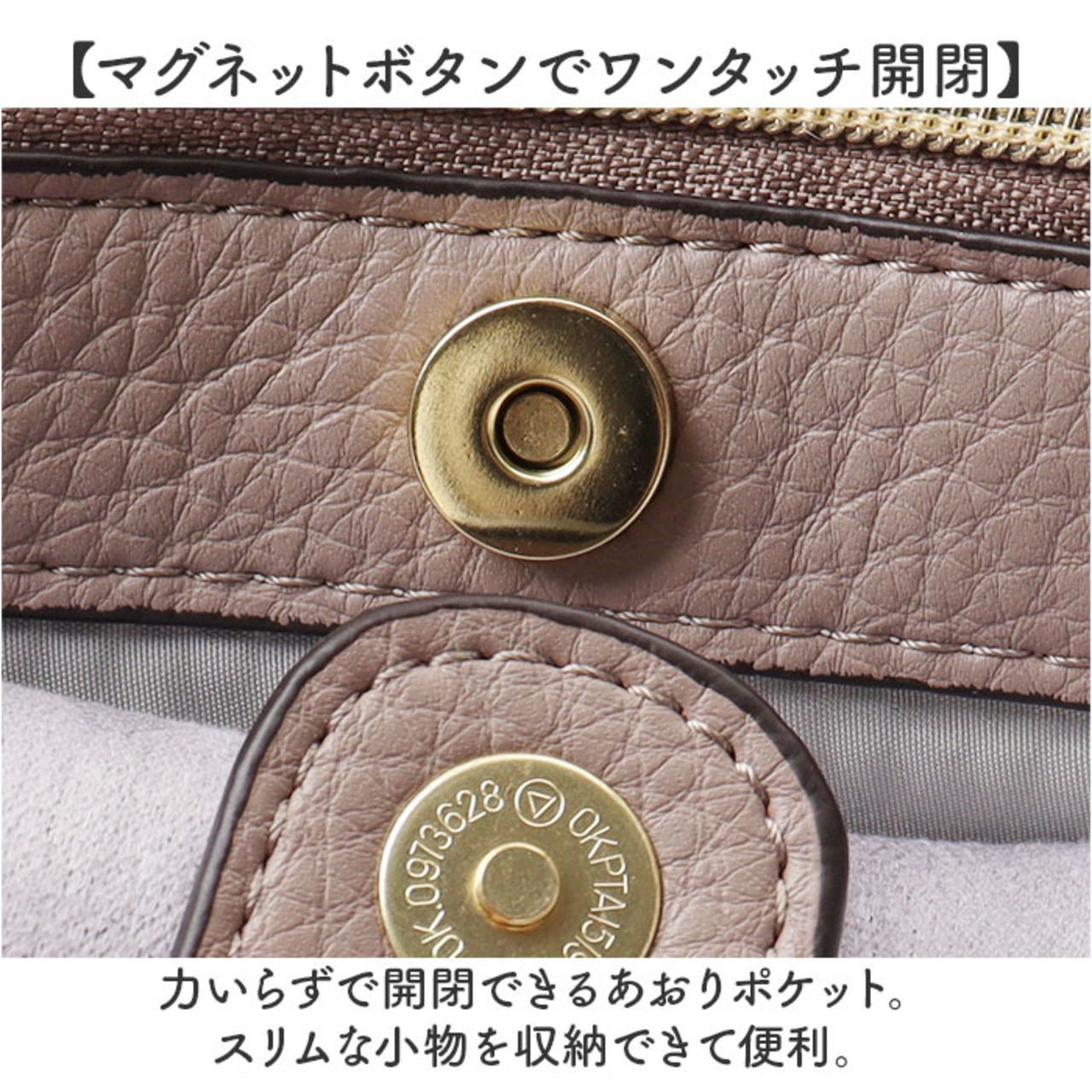 ・力いらずで開閉できるあおりポケット。スリムな小物を収納できて便利。