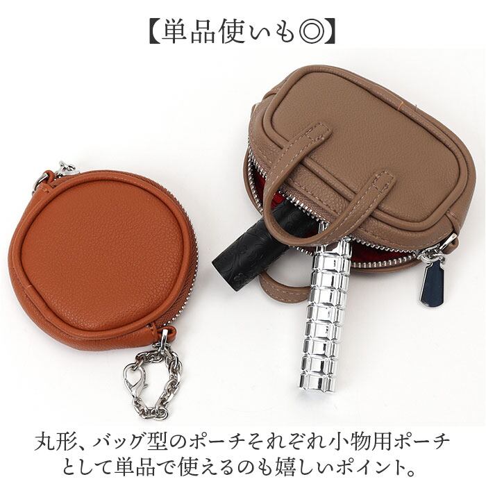 ・丸形、バッグ型のポーチそれぞれ小物用ポーチとして単品で使えるのも嬉しいポイント。
