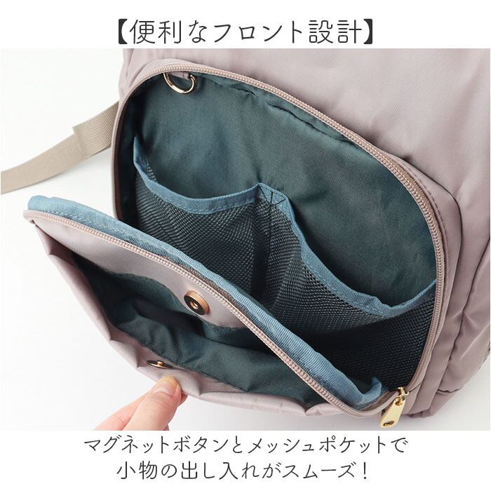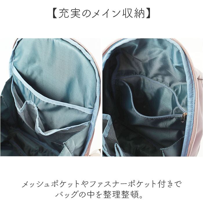 ・メッシュポケットやファスナーポケット付きでバッグの中を整理整頓。