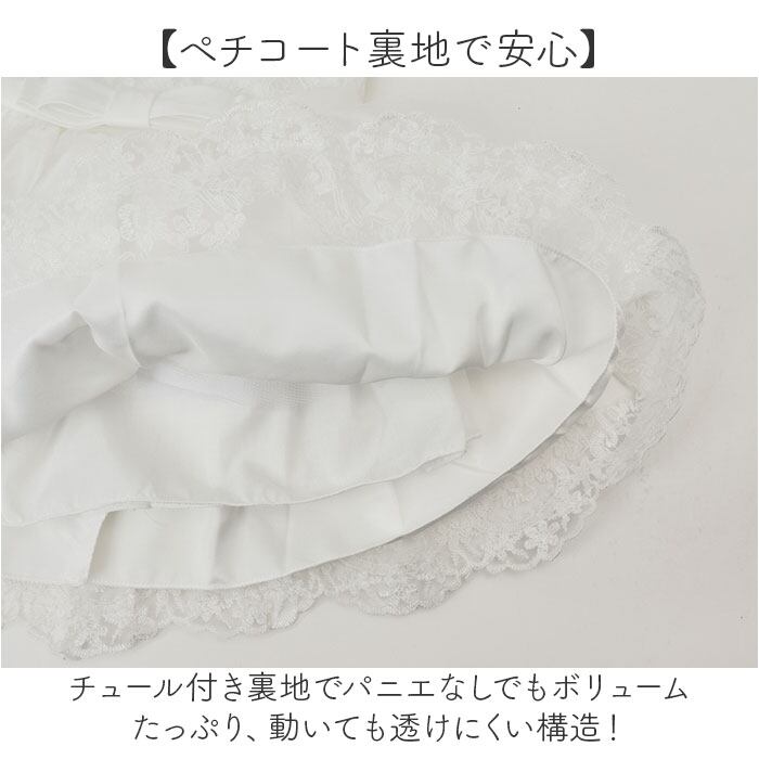 ・チュール付き裏地でパニエなしでもボリュームたっぷり、動いても透けにくい構造!