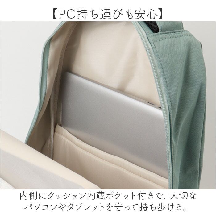 ・内側にクッション内蔵ポケット付きで、大切なパソコンやタブレットを守って持ち歩ける。