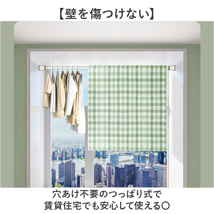 ・穴あけ不要のつっぱり式で賃貸住宅でも安心して使える〇