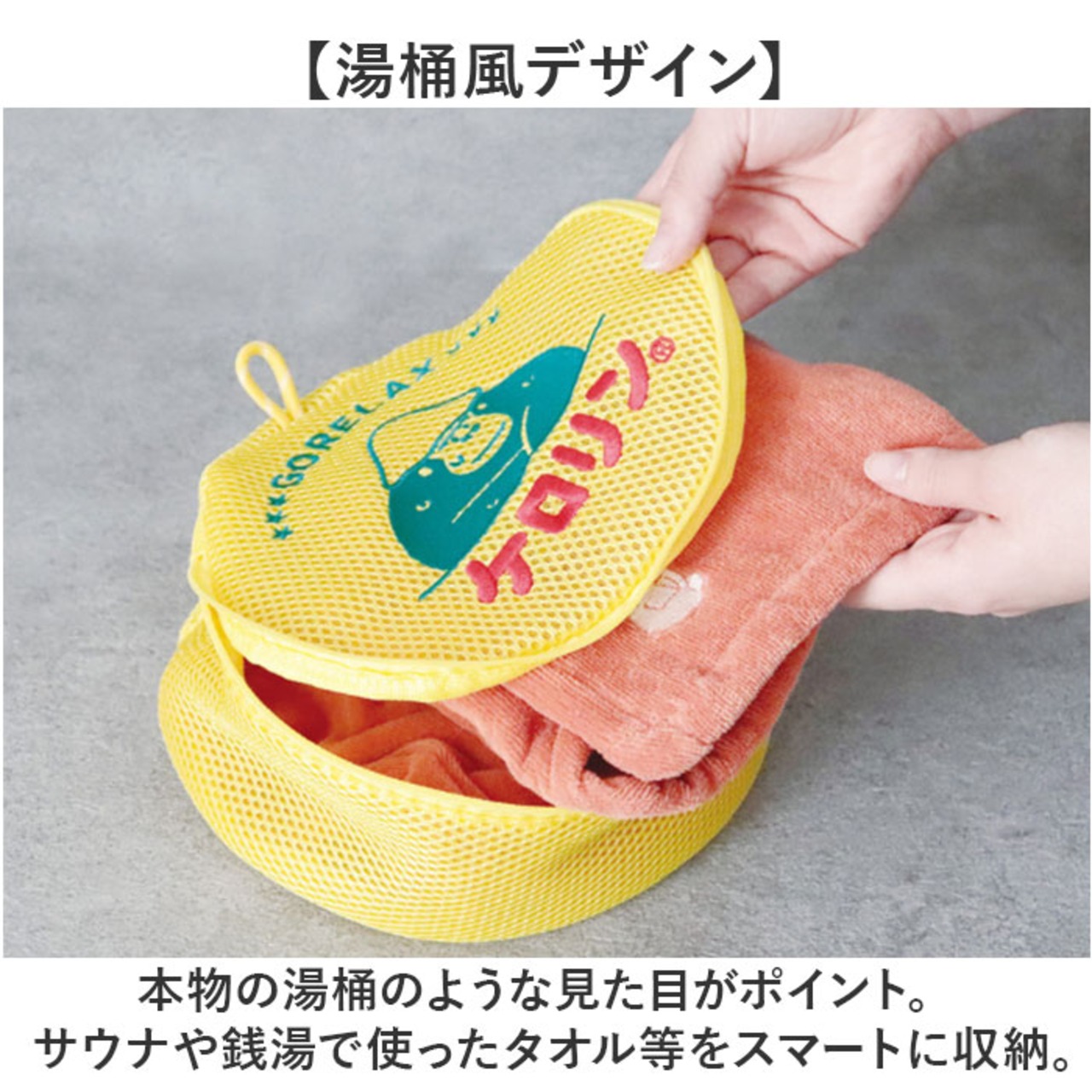 ・本物の湯桶のような見た目がポイント。サウナや銭湯で使ったタオル等をスマートに収納。