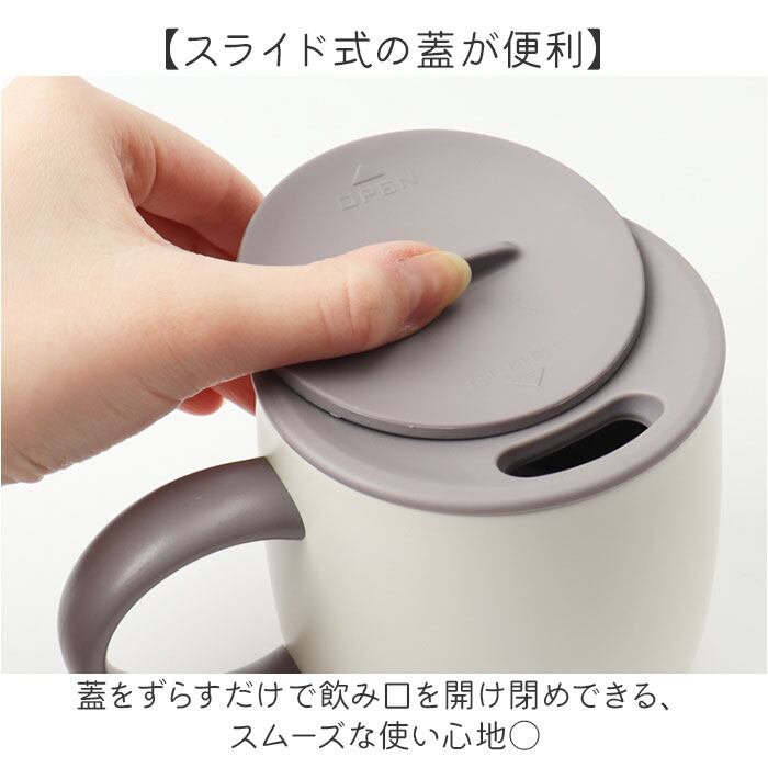 ・蓋をずらすだけで飲み口を開け閉めできる、スムーズな使い心地〇