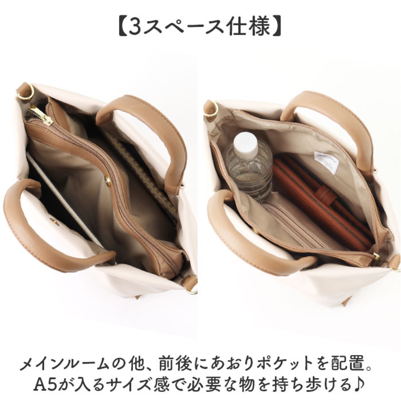 ・メインルームの他、前後にあおりポケットを配置。A5が入るサイズ感で必要な物を持ち歩ける♪