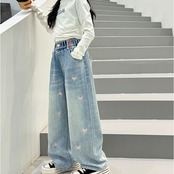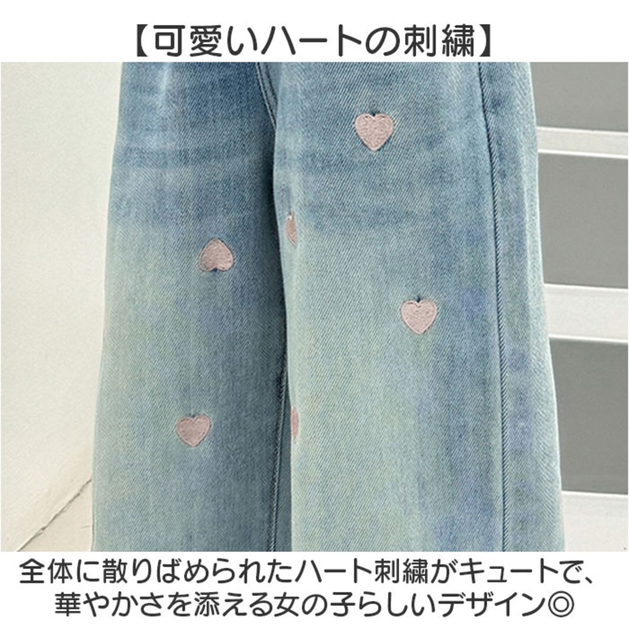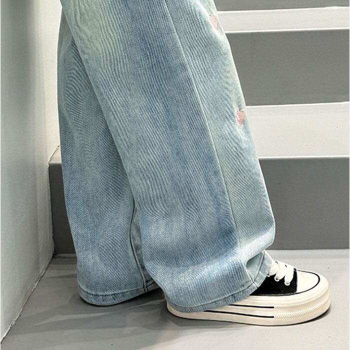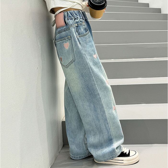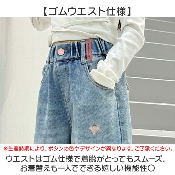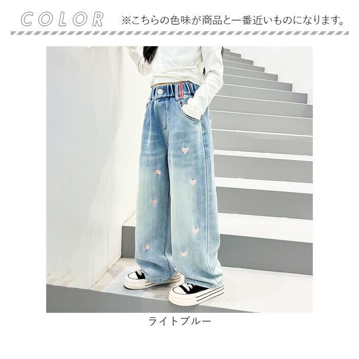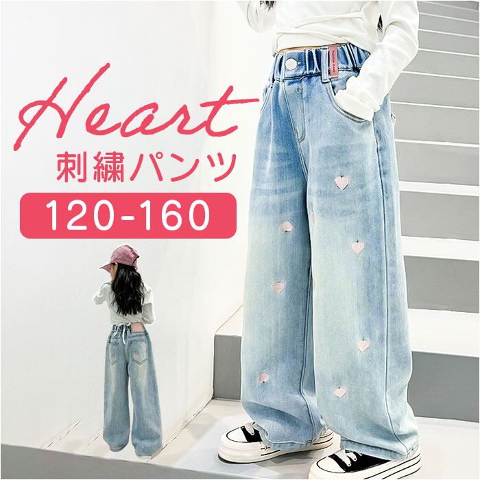 ワイドパンツ キッズ 女の子 通販 ハート 刺繍 デニム デニムパンツ ロングパンツ パンツ 長ズボン ズボン ジーンズ ジーパン ボトムス 子供服 ジュニア ガールズ 春 秋 カジュアル かわいい おしゃれ