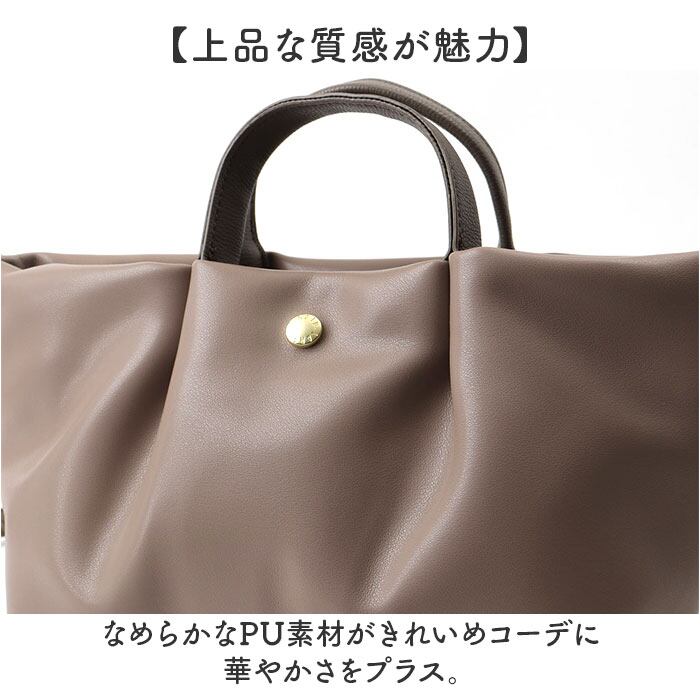 ・なめらかなPU素材がきれいめコーデに華やかさをプラス。