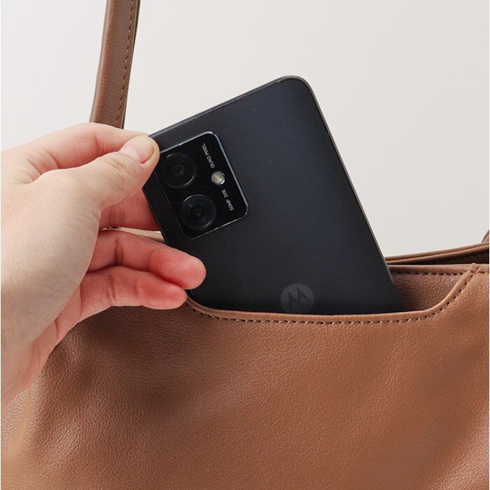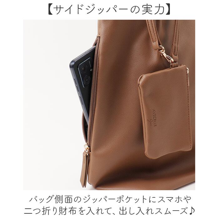 ・バッグ側面のジッパーポケットにスマホや二つ折り財布を入れて、出し入れスムーズ♪