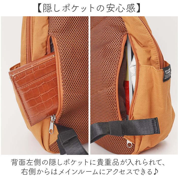 ・背面左側の隠しポケットに貴重品が入れられて、