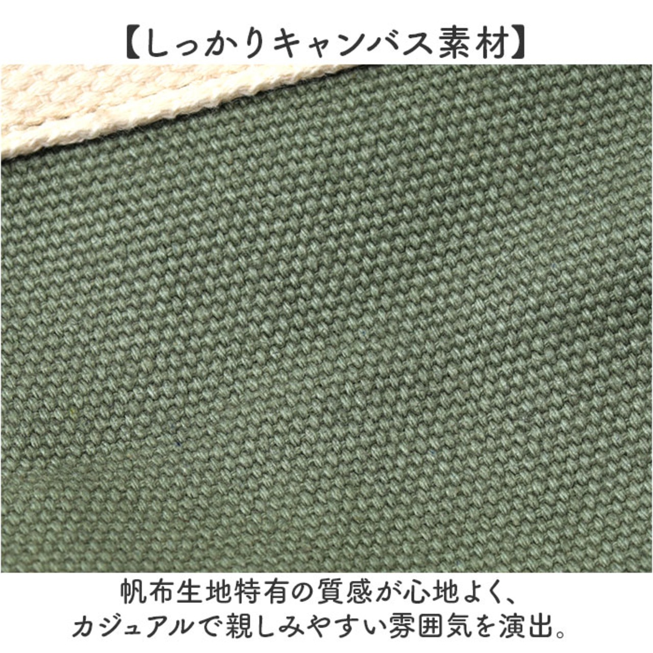 ・帆布生地特有の質感が心地よく、カジュアルで親しみやすい雰囲気を演出。