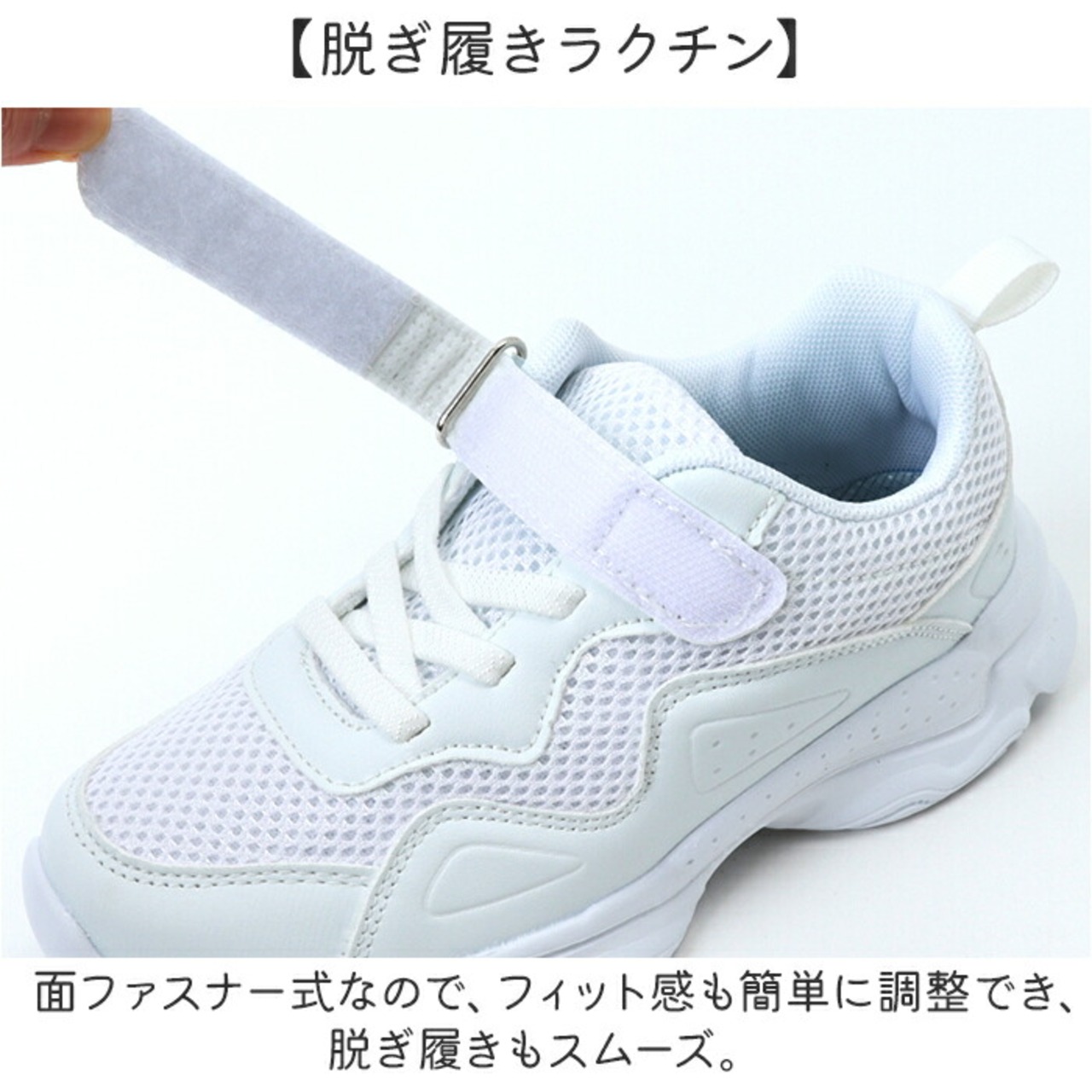 ・面ファスナー式なので、フィット感も簡単に調整でき、脱ぎ履きもスムーズ。