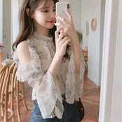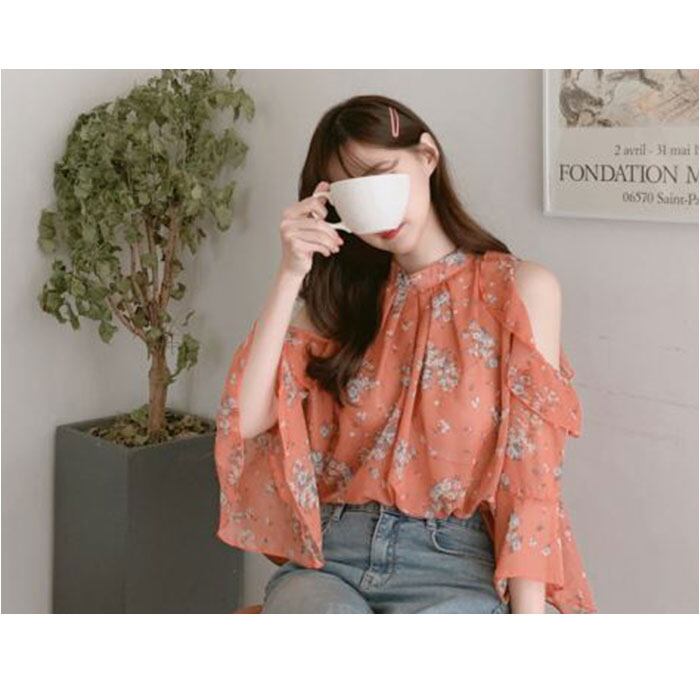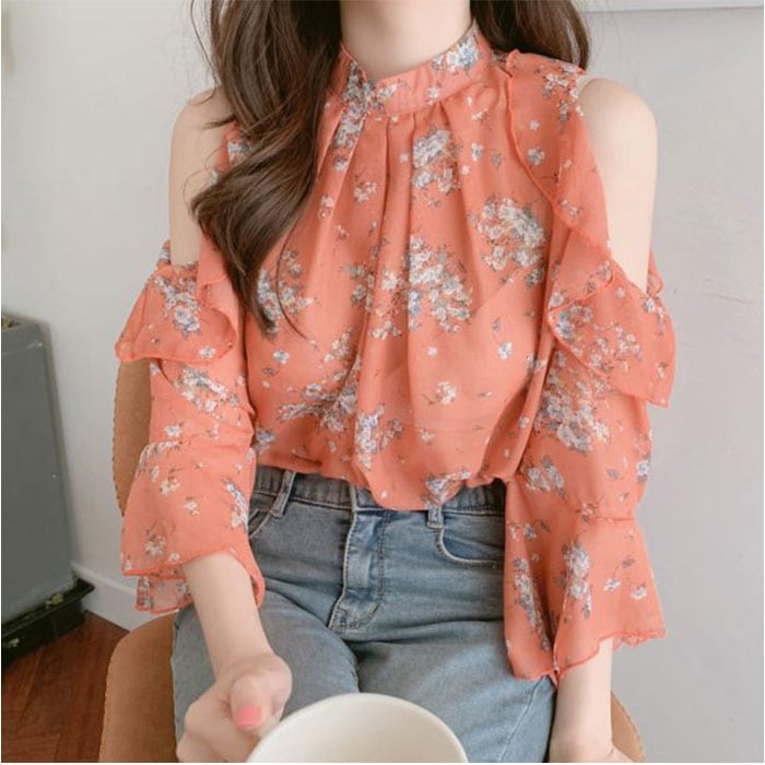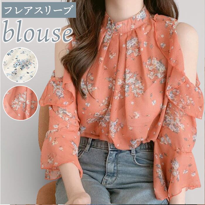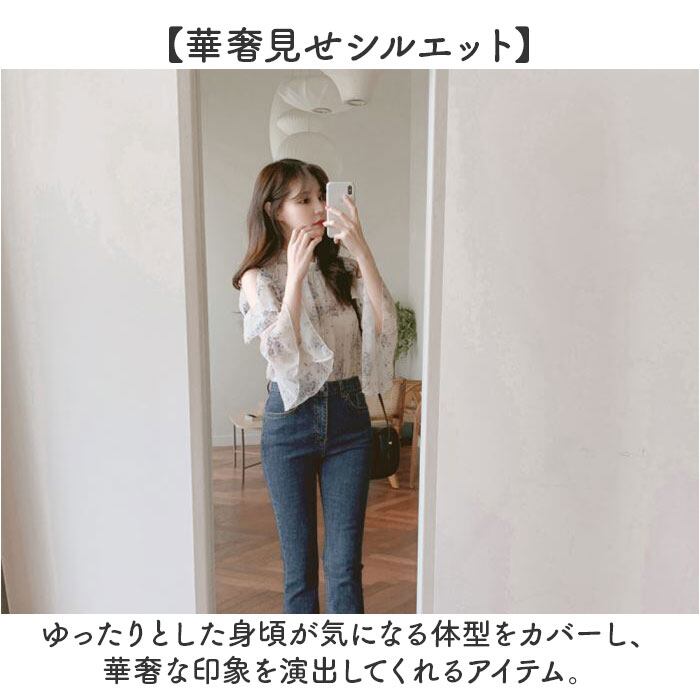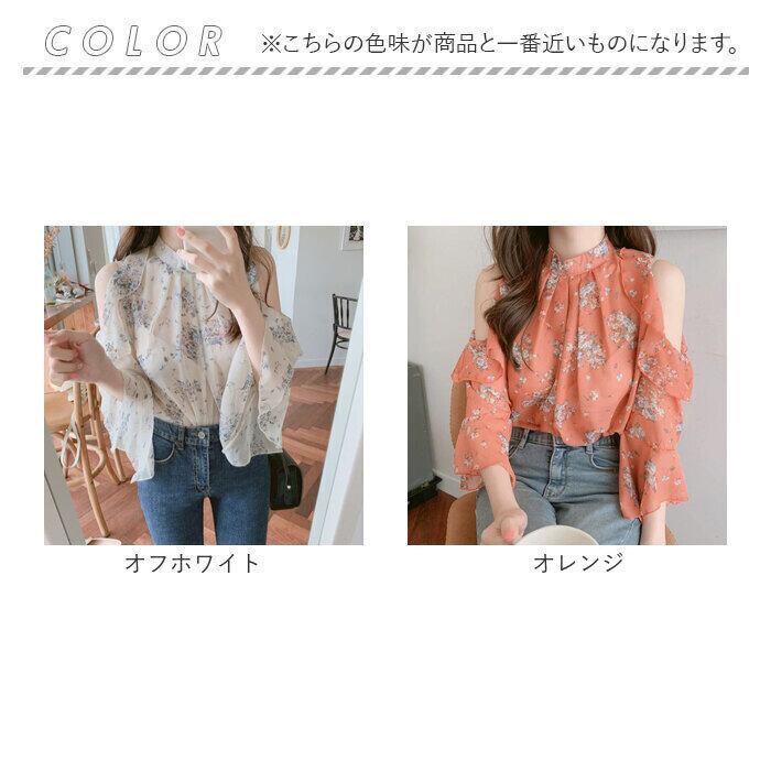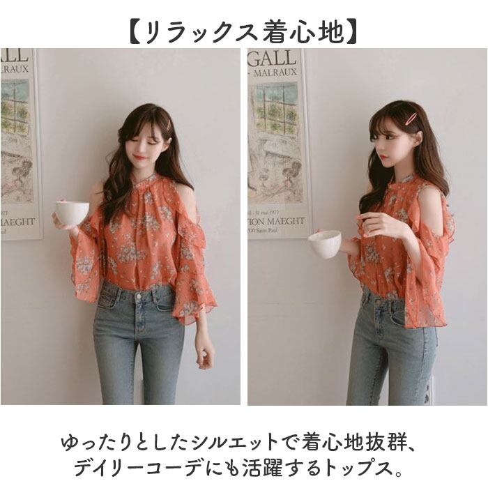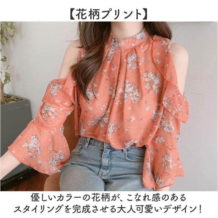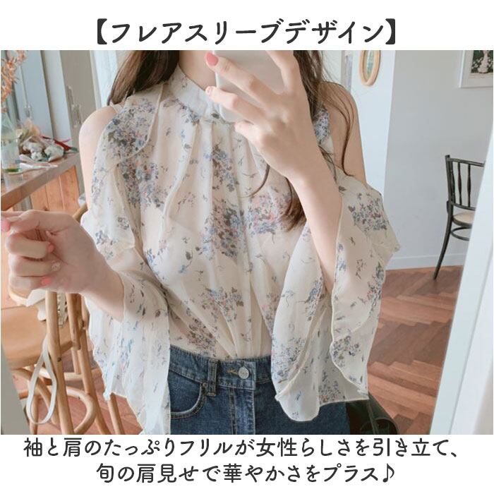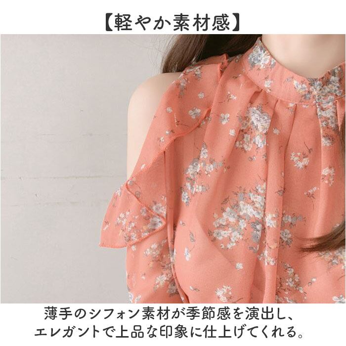 ・袖と肩のたっぷりフリルが女性らしさを引き立て、旬の肩見せで華やかさをプラス♪
