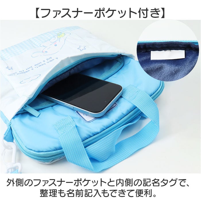 ・外側のファスナーポケットと内側の記名タグで、整理も名前記入もできて便利。