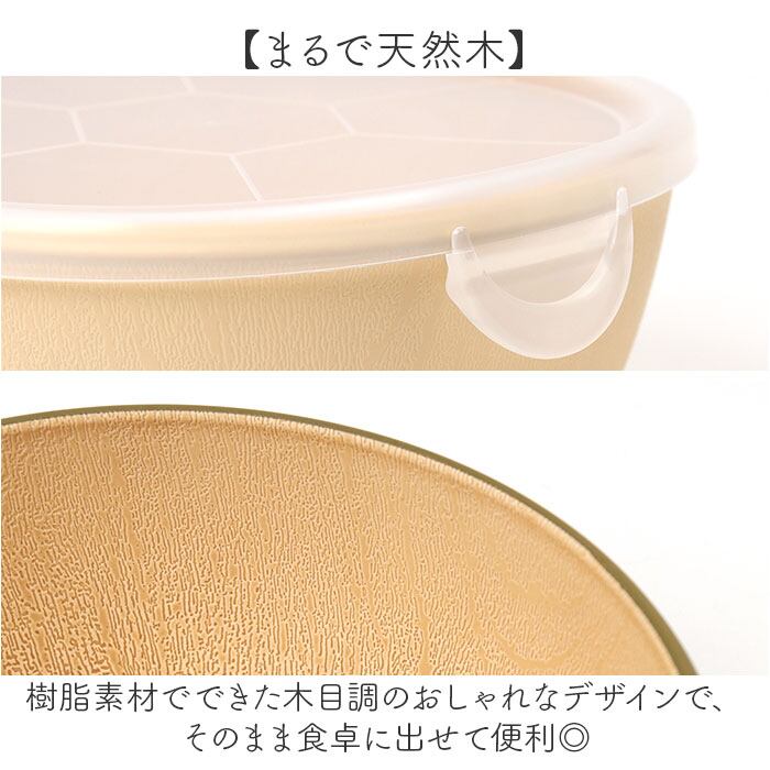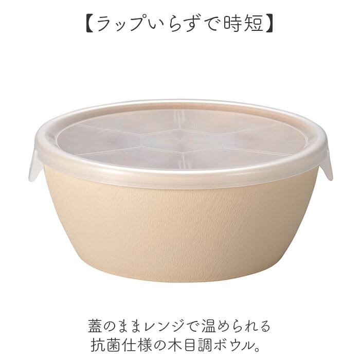 ・蓋のままレンジで温められる抗菌仕様の木目調ボウル。