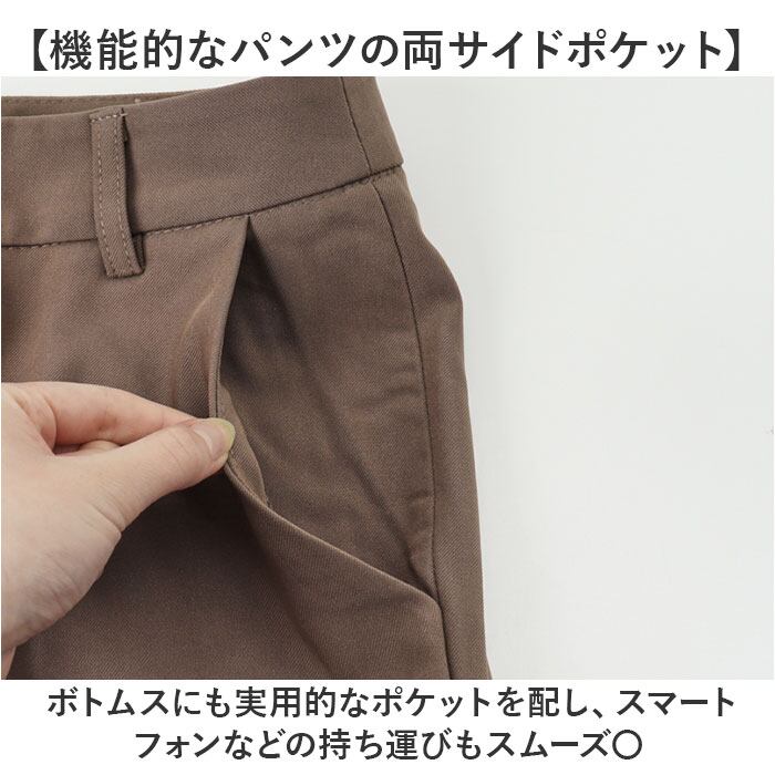【機能的なパンツの両サイドポケット】 ボトムスにも実用的なポケットを配し、スマートフォンなどの持ち運びもスムーズ〇