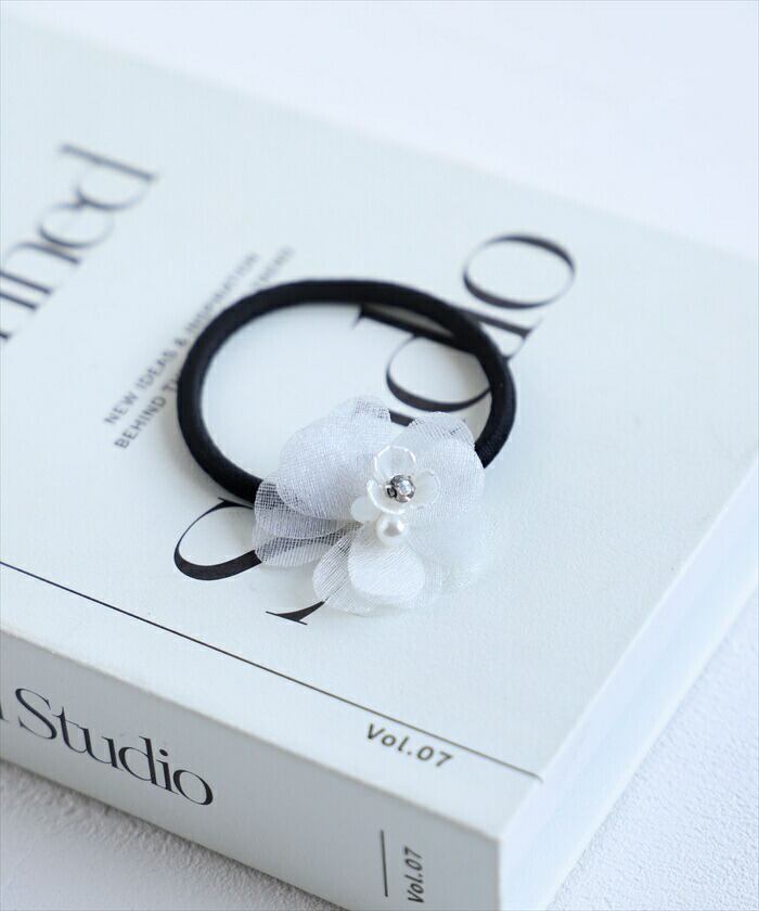・透け感のあるオーガンジー素材の花びらが優しく重なり合い、光をまとうたびに上品な輝きを放ちます。