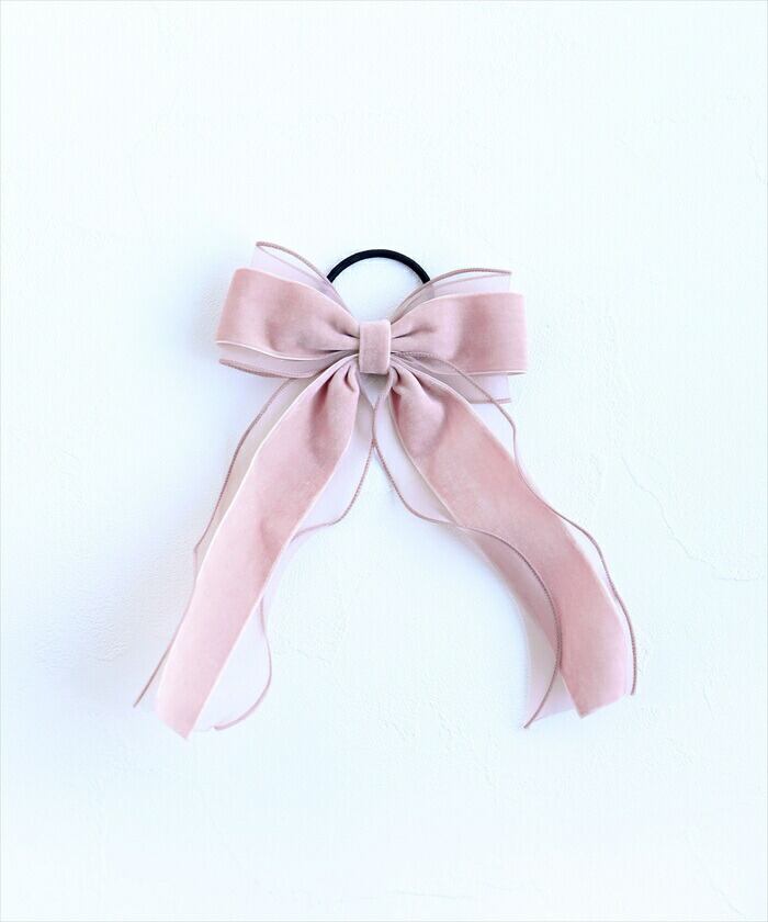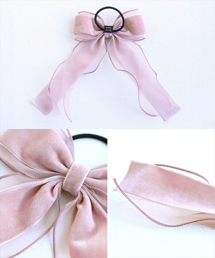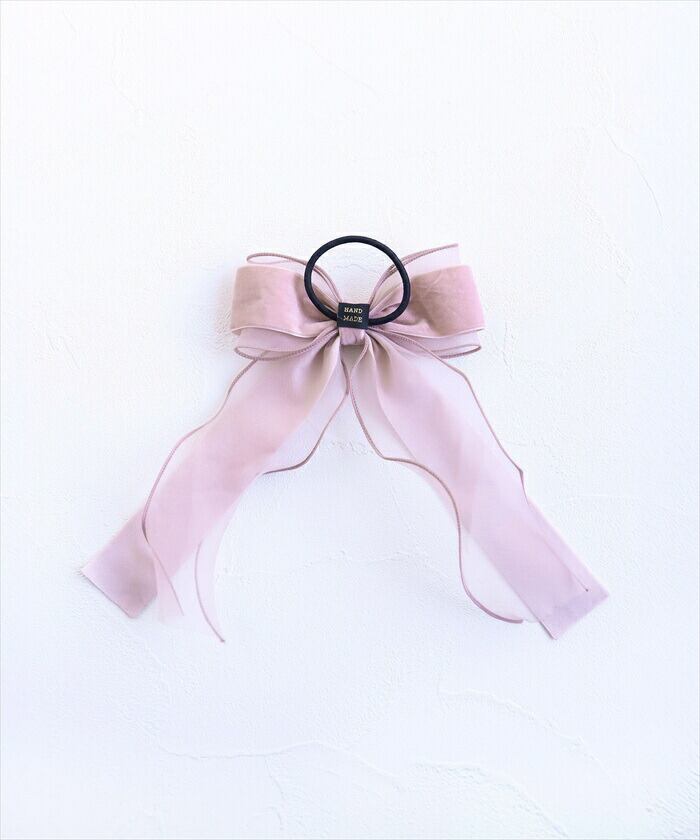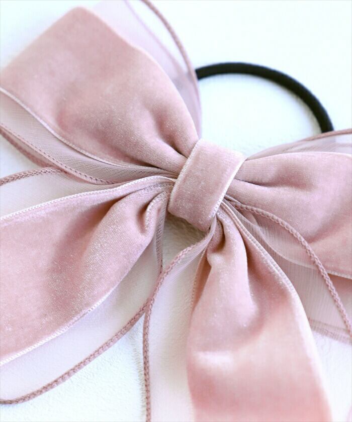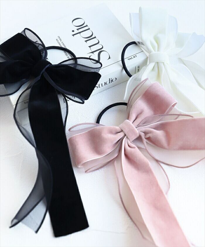 ・ふんわり軽やかな透け感のあるオーガンジーと、 しっとりとした光沢が魅力の高級ベロアを贅沢に重ねた きれいめリボンの「グレース リボン ヘアゴム」。