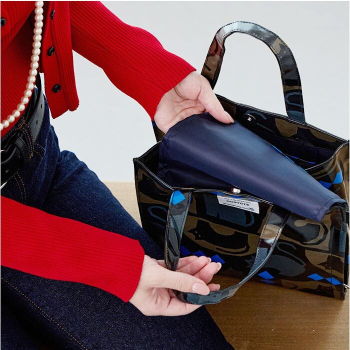 ・中身が見えない工夫がされている機能的なトート。本体内側に目隠し用のベロが付いています。荷物の上にベロ部分をかぶせれば、中身を隠すことができます。
