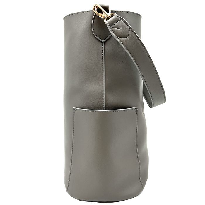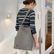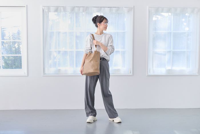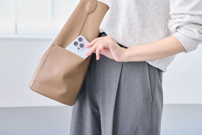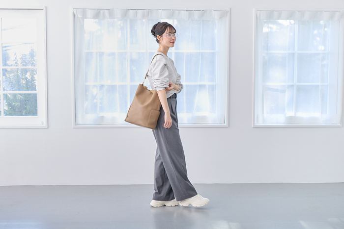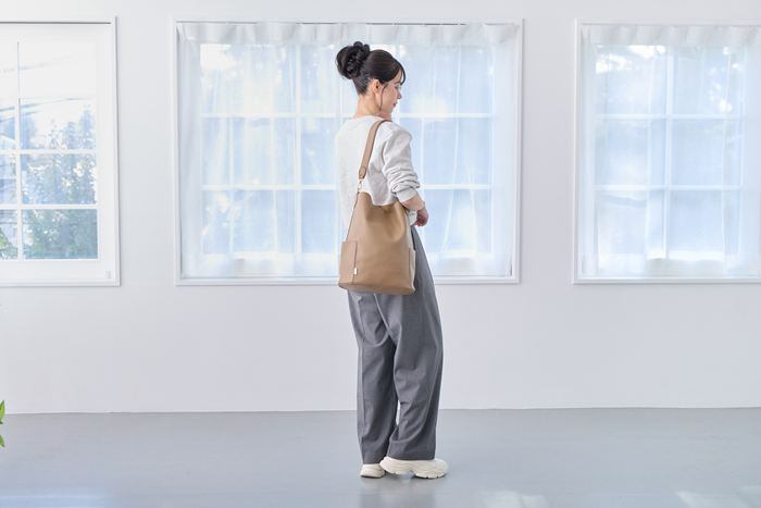 ・ワンハンドルの持ち手は肩掛けもスムーズ。やわらかさと適度なハリを持つ合皮が、体にしなやかに寄り添います。