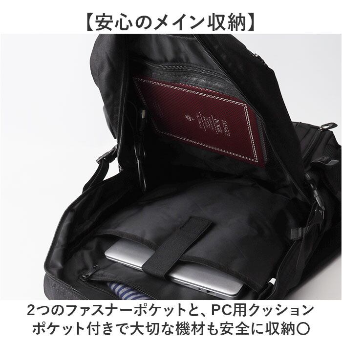2つのファスナーポケットと、PC用クッションポケット付きで大切な機材も安全に収納〇