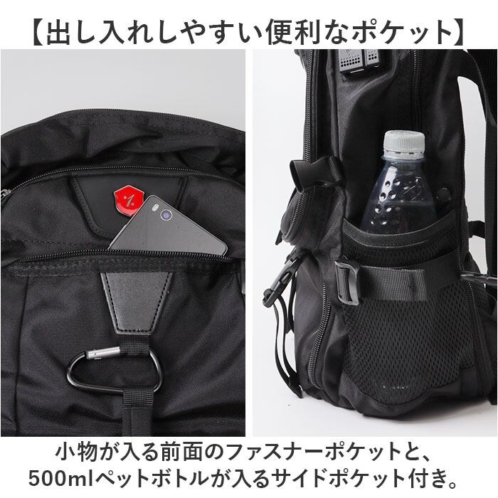 ・小物が入る前面のファスナーポケットと、500mlペットボトルが入るサイドポケット付き。
